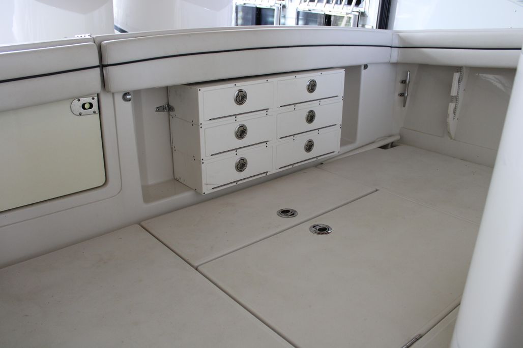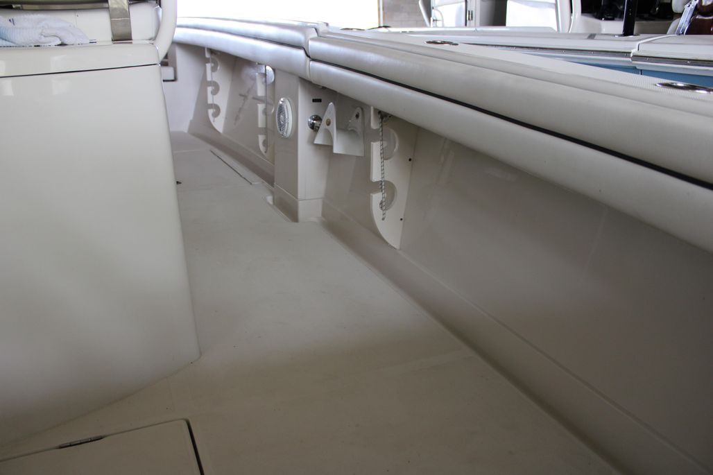 Bait prep center with 45-gallon stand-up livewell, custom tackle storage, rod holders, freshwater sink and shower