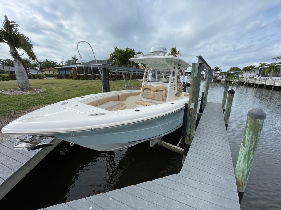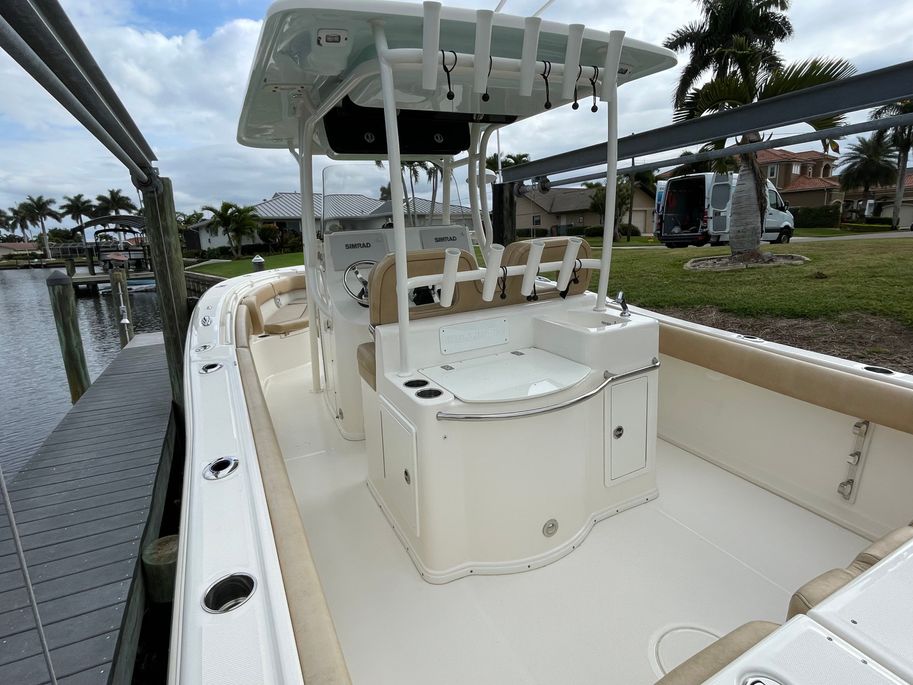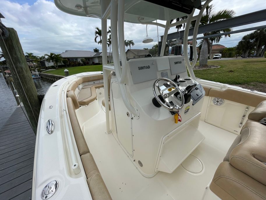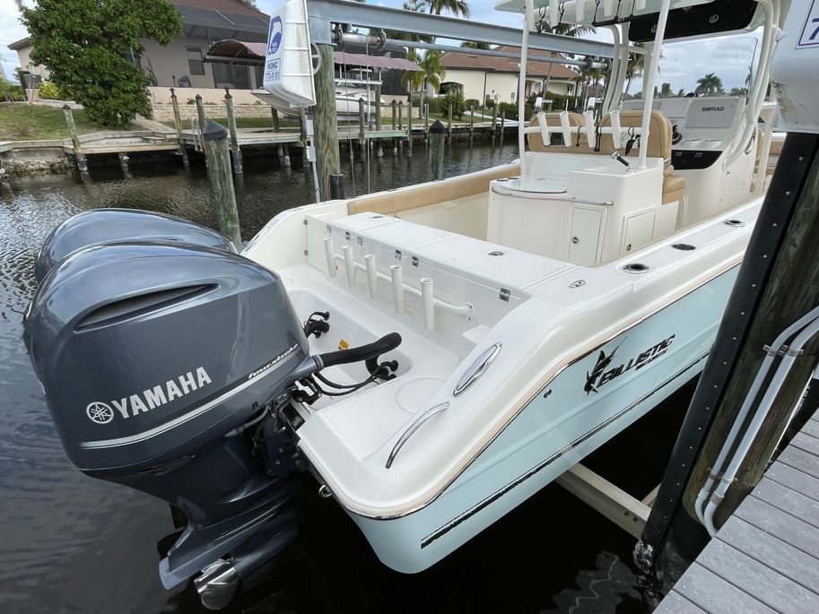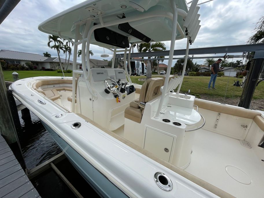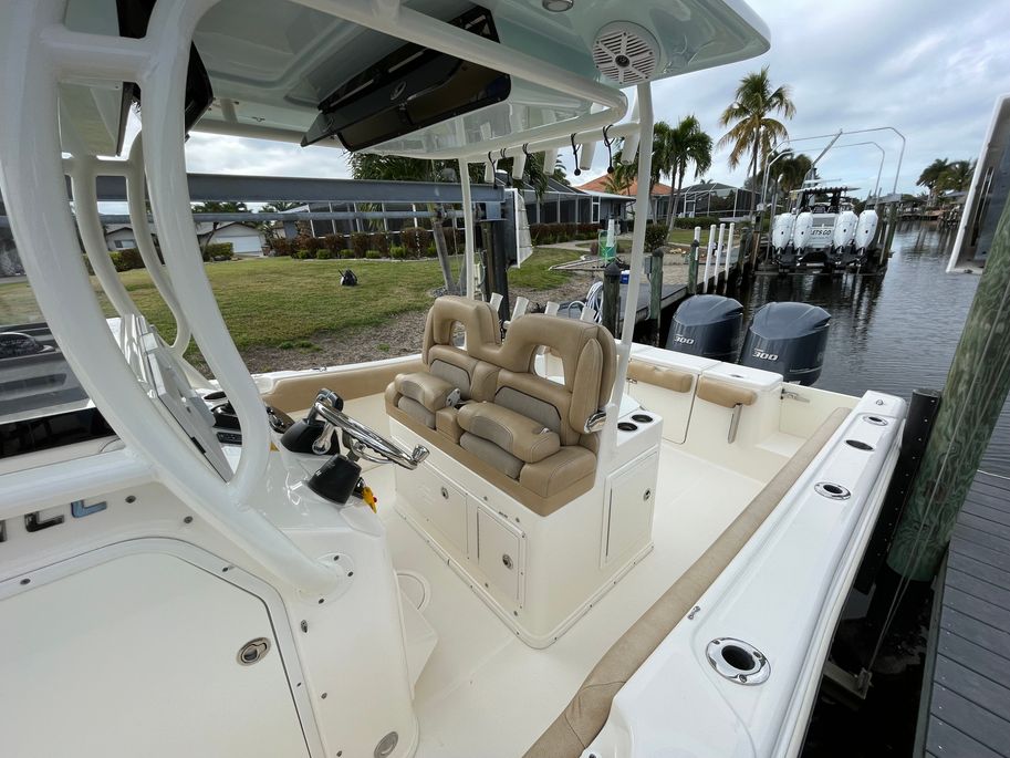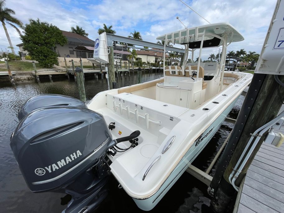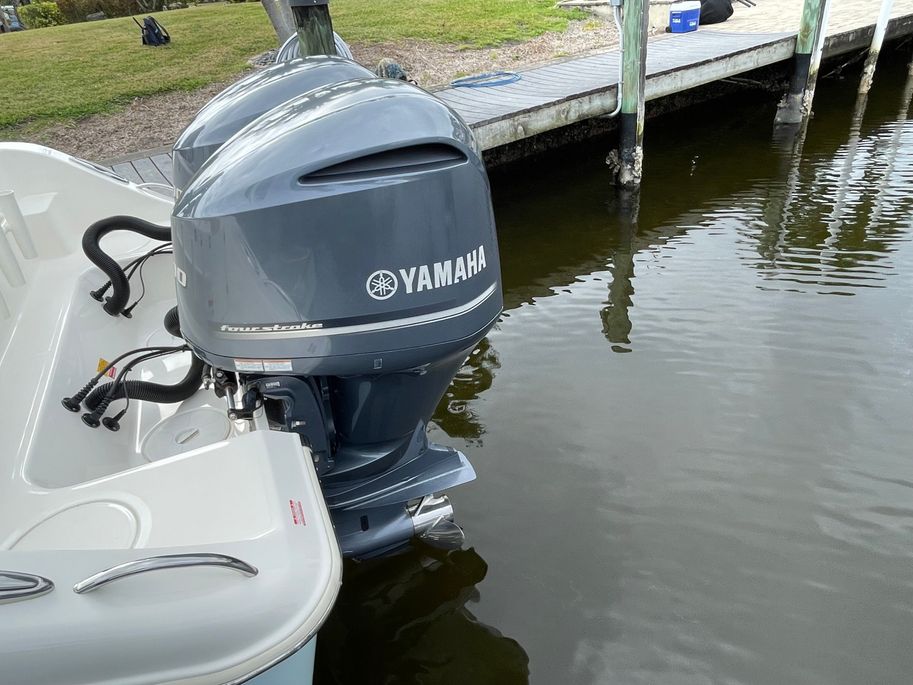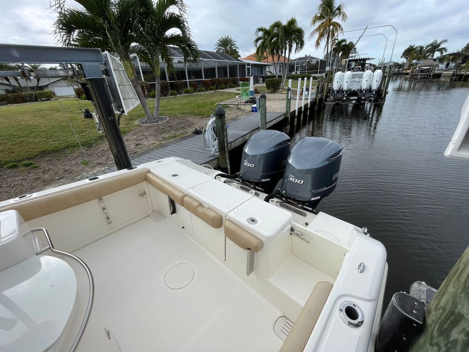 Powered by reliable professionally maintained twin Yamaha 300HP outboards with stainless props and a top speed near 60 mph. Features include joystick control, dual Simrad chartplotters, radar, autopilot, Simrad VHF, Bennett trim tabs, electric windlass with stainless anchor, livewell, freshwater sink, raw and freshwater washdowns, underwater lighting, forward bow flood lighting, and an enclosed electric flush head.