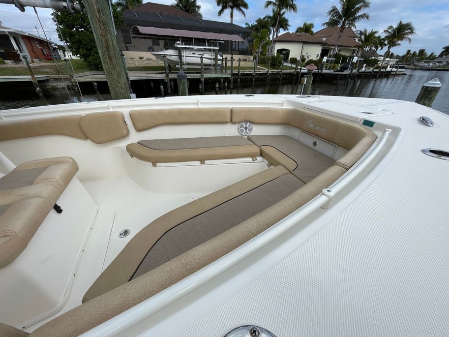 Comfort highlights include helm seating with flip-up bolsters and armrests, Polk Audio system with SiriusXM, stainless cleats, cup holders, ample rod storage, and generous under-seat and in-deck storage.