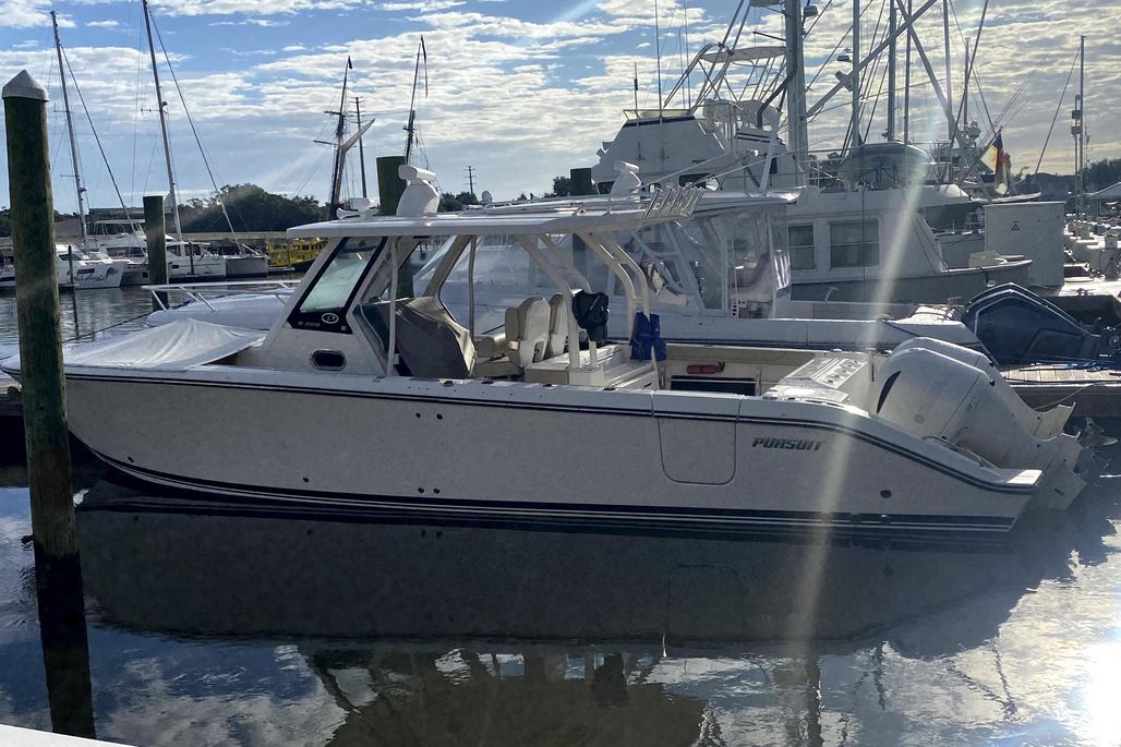 The Pursuit S 328 will broadens the sport series range. Series styling translates to 32 including the oversized fiberglass integrated hardtop and windshield system, updated classic sheerline, throughstem anchor system and integrated transom extensions. The exterior styling will be complimented inside by a forward wrap-around lounge at the bow just opposite of the forward facing seating in the console. A large helm seat faces the generous console with access to the console getaway below. A two-person berth converts to an aft facing seat with large open storage areas port and starboard. A head and sink with vanity could let you overnight and at least freshen up for a dinner shore side. The aft cockpit accommodates serious fishing and with the fold away fore and aft seats quickly converts to a social area at the dock. All your fishing necessities are built in and the new Pursuit optional side dive door adds to the overall use.