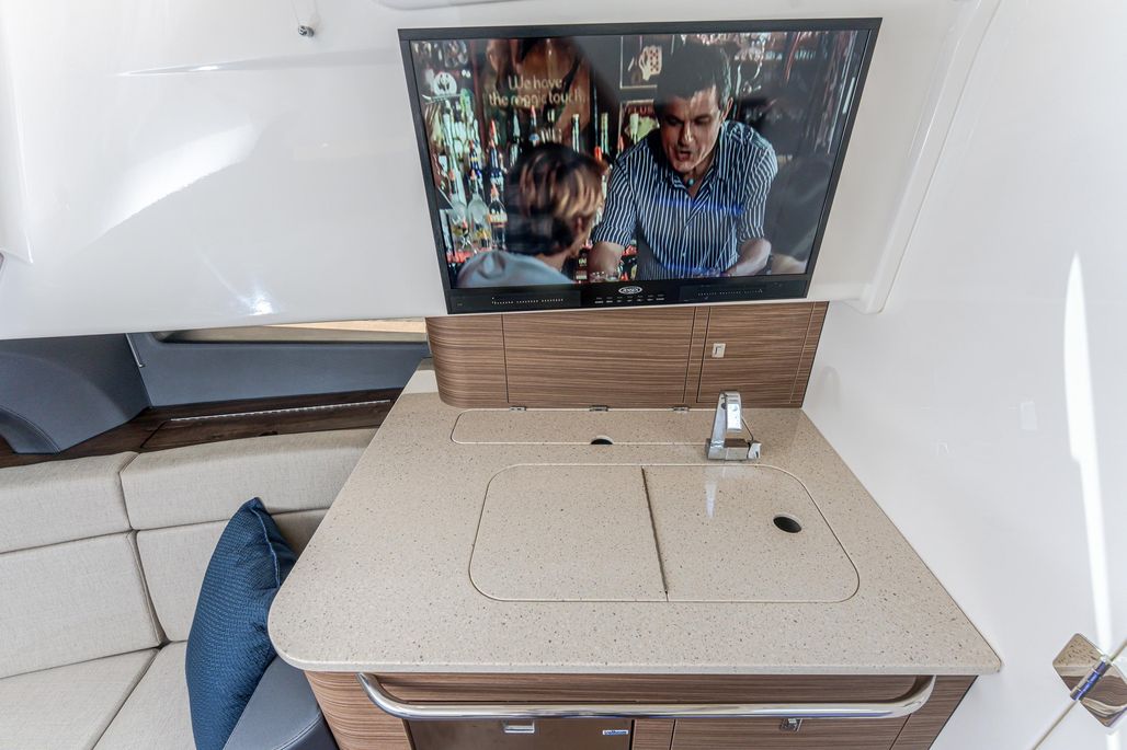 - Spacious cabin with V-berth offers 7 feet of headroom and two available color schemes.