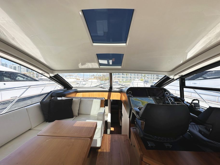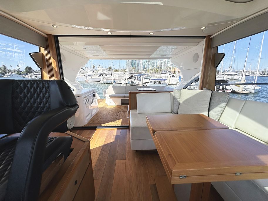 The expansive aft cockpit features a large sunpad, wet bar, dining area, and access to the hydraulic swim platform perfect for swimming, diving, or launching the William’s tender from the garage. Through the sliding glass door step inside to a beautifully finished salon with expansive windows, light cabinetry and a seamless open-plan layout. Lowering the glass panel between the cockpit and salon blurs the line between indoor and outdoor living. Large windows and the retractable hardtop glass sunroof allow plenty of natural light to illuminate all of the entertainment areas. The galley is fully equipped with top-of-the-line appliances and blends effortlessly into the lounge areas making entertaining a breeze.