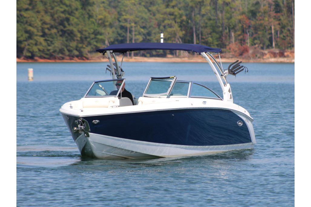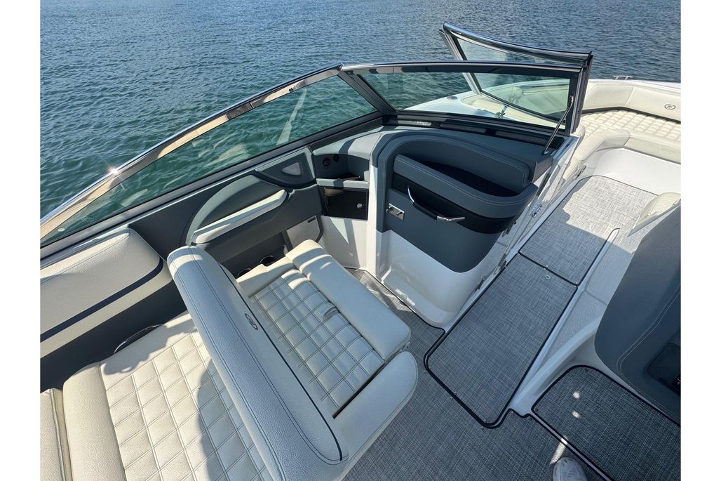 This stunning boat has a Navy hull side, Frost Grey bottom, and White boot stripe, complemented by a stylish Tahoe Grey interior with Navy piping for a sleek, refined look. A white forward-folding arch with a Navy bimini adds style and shade, while brushed aluminum wakeboard racks and tow balls on both port and starboard sides ensure you're ready for any watersports adventure.