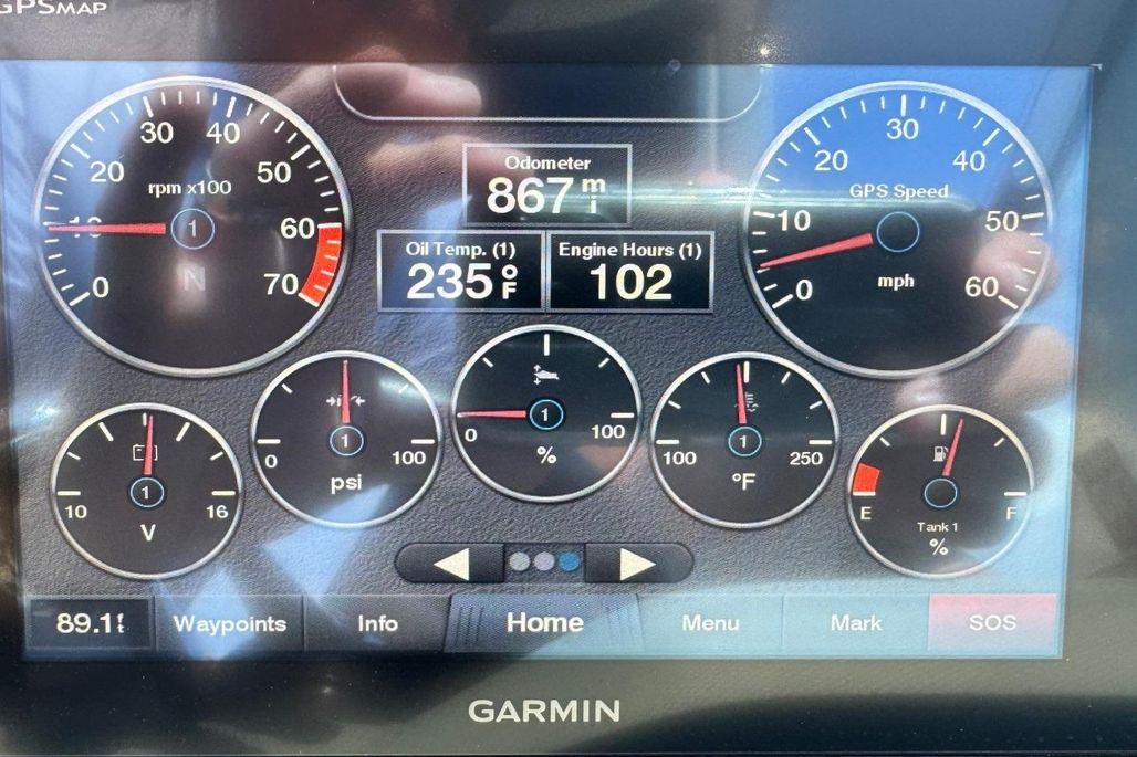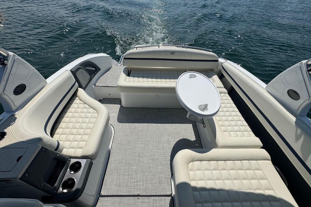 Enjoy your favorite tunes on the upgraded Premium Sound System, complete with transom speakers and remote, all powered by dual Garmin screens for full navigation and surf control.