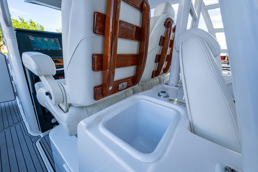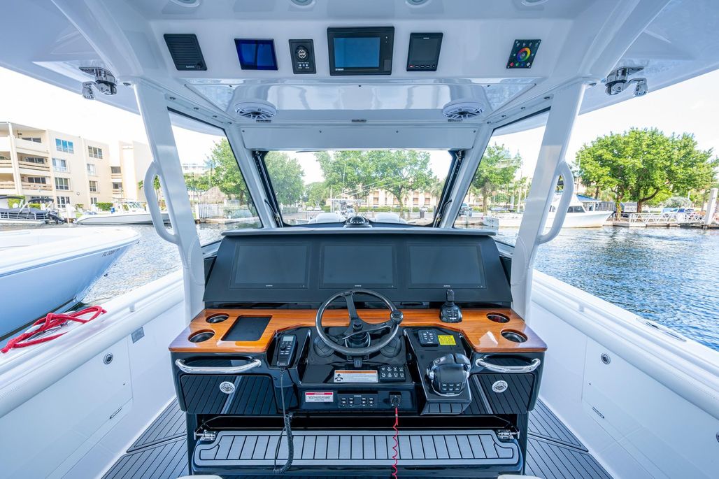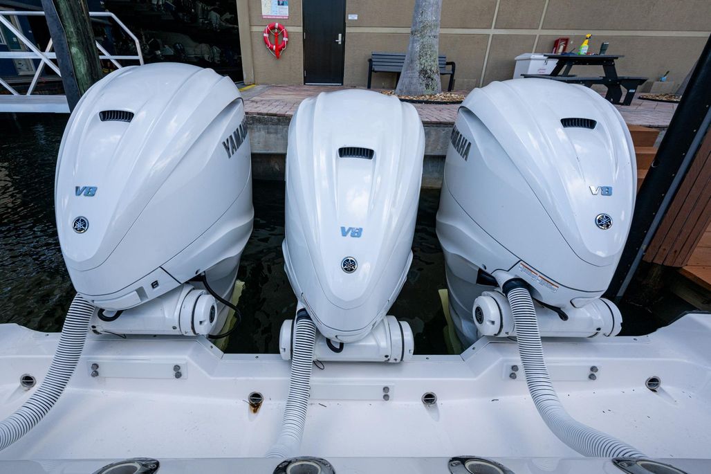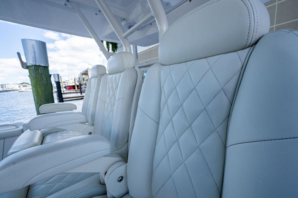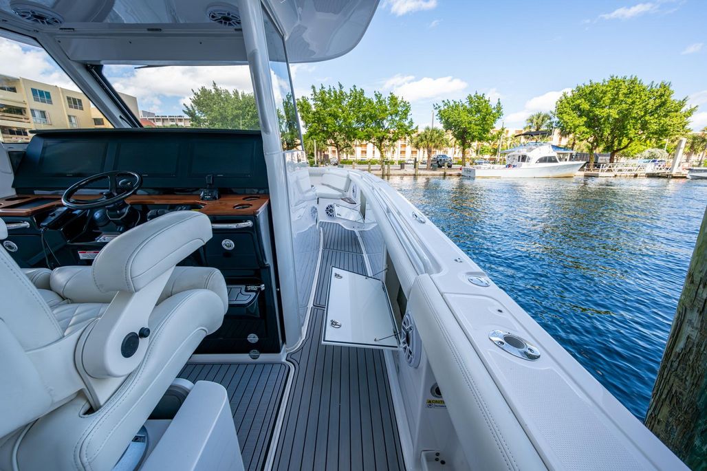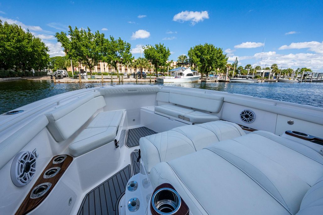This 395 Everglades is well equipped with reliable triple Yamaha 425,s with CL7 Display and helm master. She has a 3 monitor Garmin package including chirp, Radar, Generator and a Sea Keeper 3 to name a few. Her elegant flint gray interior new and factory installed along with all new interior cushions makes her show ready. REEL HOT is equipped with three Pompanette helm chairs with varnish back rest, a carbon fiber steering wheel, command center A/C, and two large refrigerated chill plate boxes one behind the helm chairs and a large chill box on the transom. Her teak accent Cup holders and arm rest at the console and swim pad add a very luxurious touch. Her many upgrades and factory replaced items are available on the vessel for viewing.