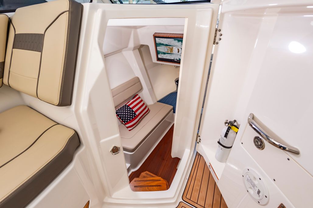 The cabin is easily accessible with a fiberglass door and features solid wood accents with modern finishes, a full berth forward and a comfortable aft berth. A small family or couple may overnight with basic amenities for the weekend. Hull side windows reveal plenty of natural light below.