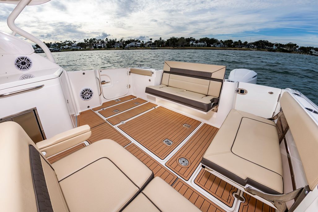 Forward bow and port side lounge seating, a swivel seat at the helm and patent-pending fold away seating at the transom and under the gunwale give your crew a comfortable place to enjoy whatever type of water activities you choose.