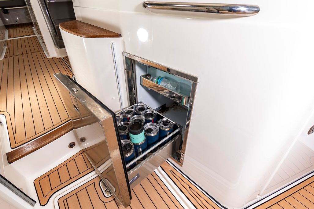 Foldaway seating quickly transforms a social venue to a wide-open, fish-ready cockpit with hull side door, livewell, gunwale mounted rod holders and insulated fish-boxes in the floor.
