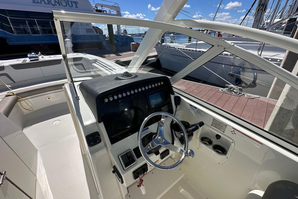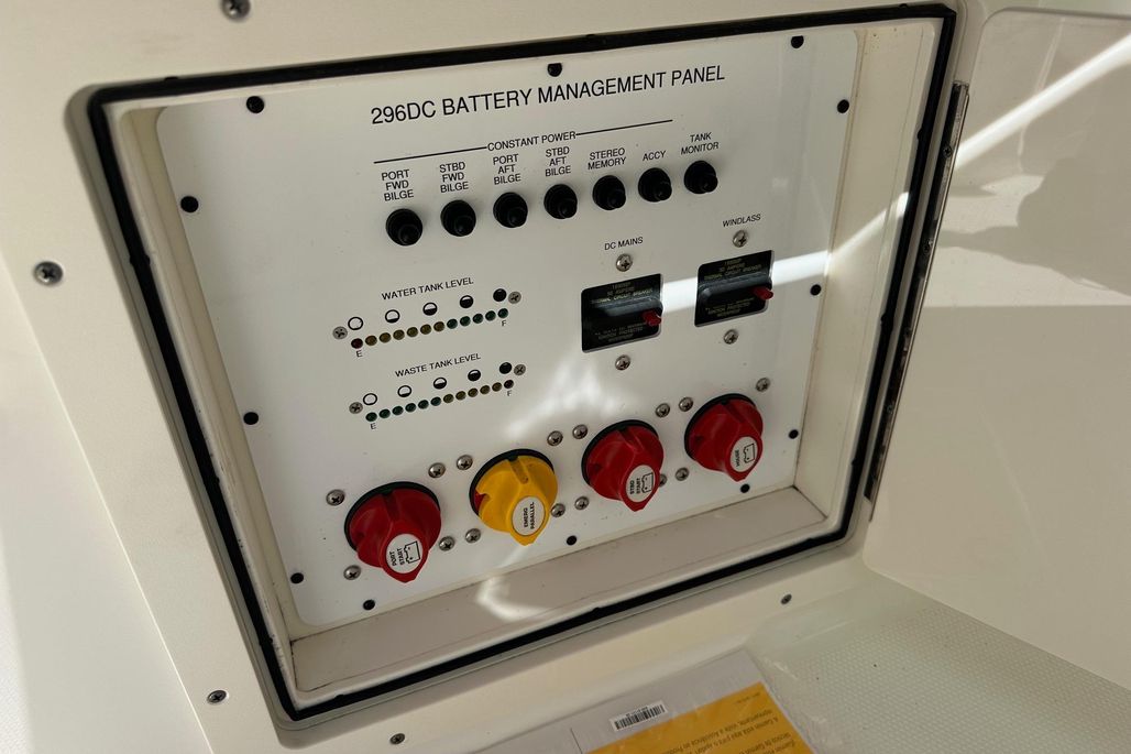 - Starboard console storage area with removable floor lids for access to (3) batteries and waste tank. Area also provides access to electronics