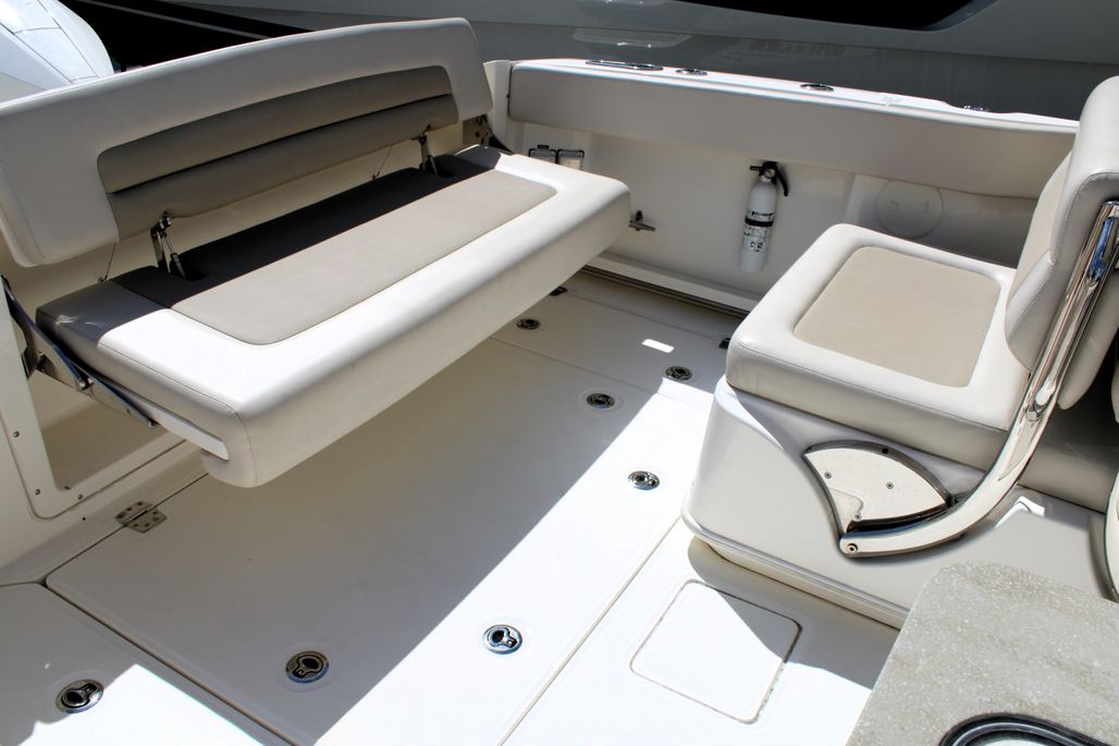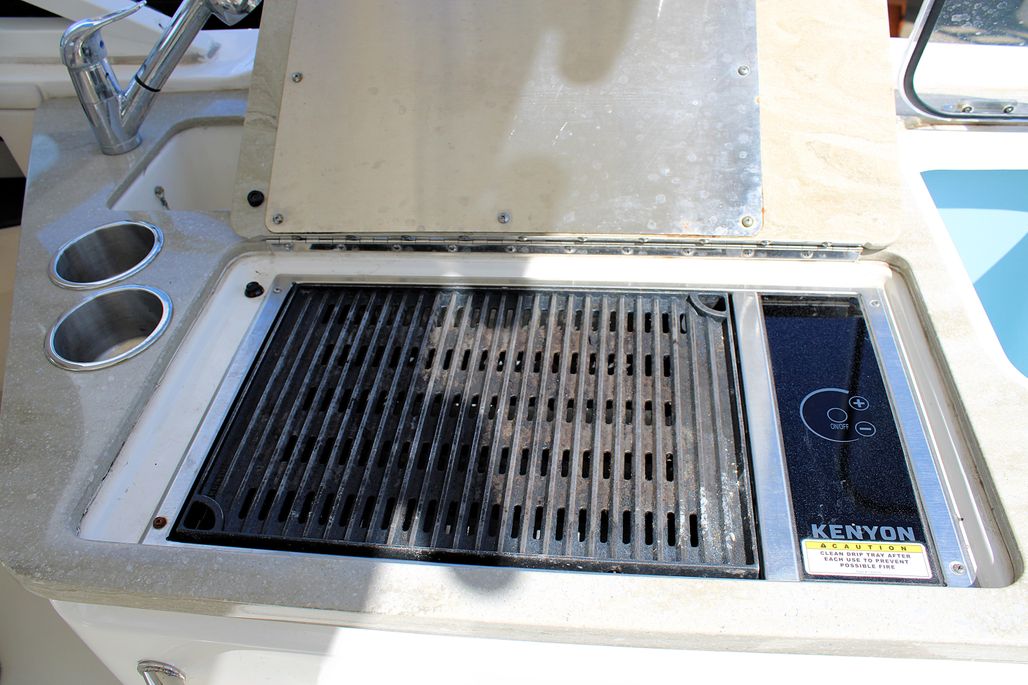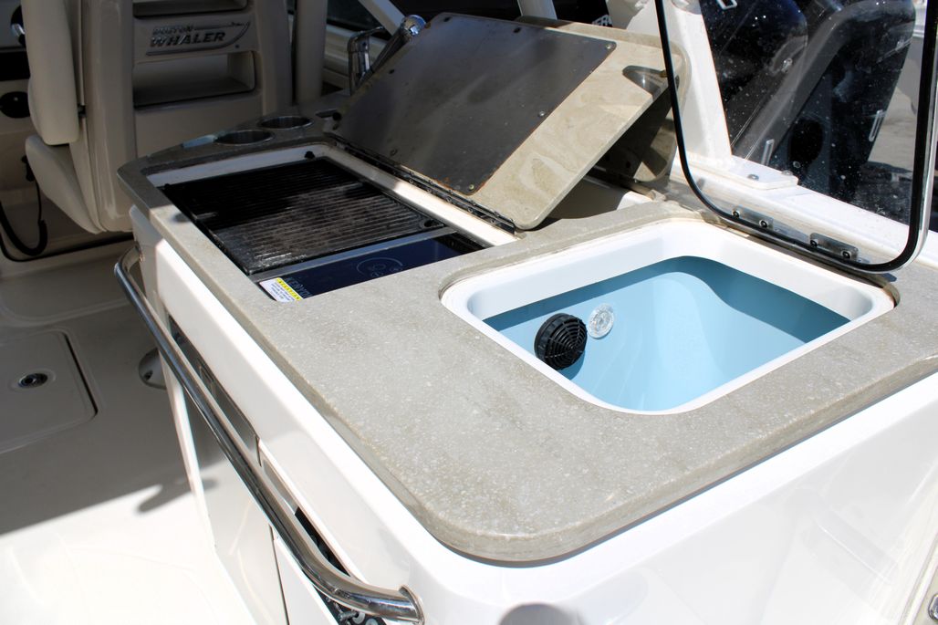 - A cockpit utility center includes a sink, 18-gallon cooler and prep surface, plus optional grill and fridge.