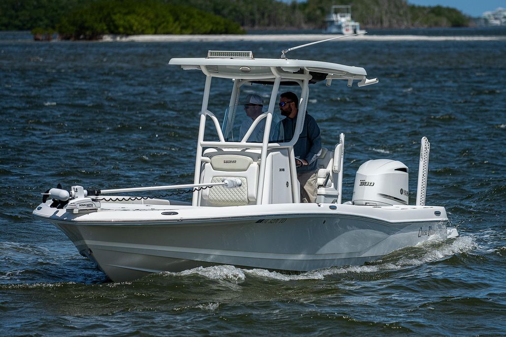 The Caymas 26 HB does it all for the serious fisherman and for family fun. Performance Starts with a Michael Peters patented Stepped-Vee Ventilated Tunnel Hull. This hull delivers speed, fuel efficiency and a precise, dry and velvet-smooth ride with a 9-foot beam. Serious fishing starts with Oversized 35 gallon live wells, maximum storage tackle, large bow/stern fishing decks and a 90-gallon fuel tank to get you to the farthest fishing grounds and back. The Caymas 26HB is designed for family fun and a day’s comfort with cushioned bow and stern seating, bow and stern cooler options, up to 8 speaker stereo, extra elbow room beam and a standard port a potti in the console when nature or a change of clothes is called for. See for yourself how the Caymas 26HB enjoys the best in marine fit and finish utilizing the highest quality marine hardware and craftsmanship. The Caymas 26HB can be rigged with a Yamaha, Mercury, Suzuki or Evinrude outboard up to 400 horsepower.