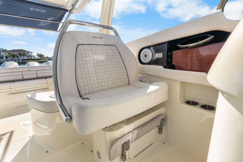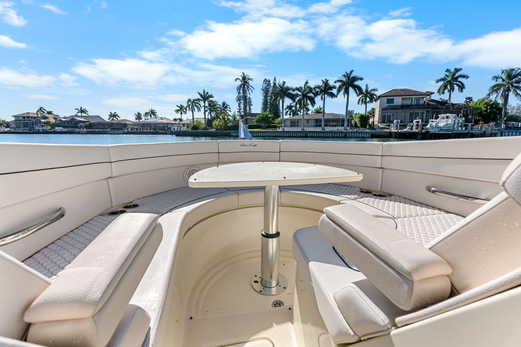 Step onboard and you’re surrounded by premium craftsmanship. Rich upholstery, stainless accents, and thoughtful design details remind you immediately why Chris-Craft sits in a class of its own. The spacious cockpit is built for entertaining, with generous seating, a well-appointed wet bar, and seamless flow throughout the boat. Forward seating is expansive and comfortable, while the aft sun lounge invites you to stretch out and relax.