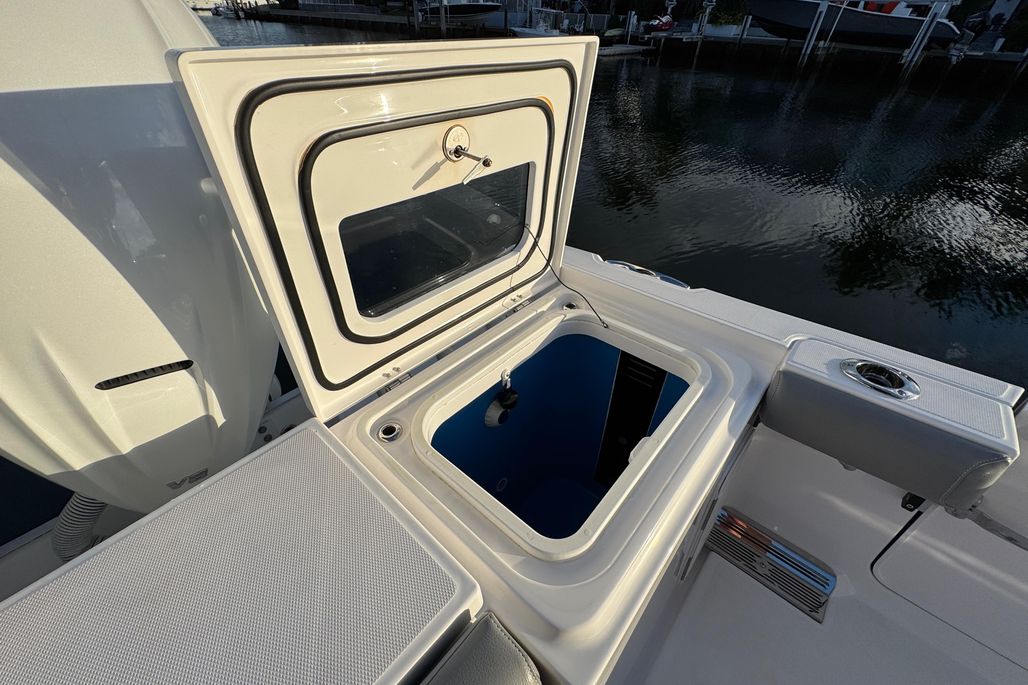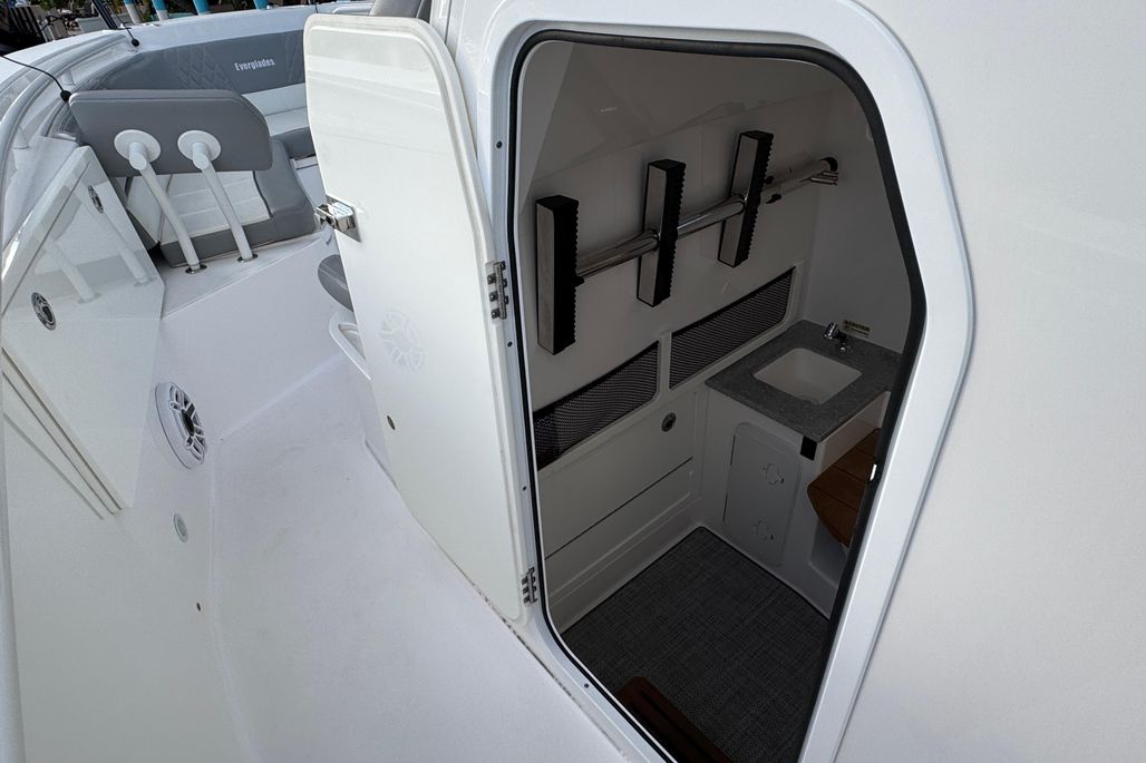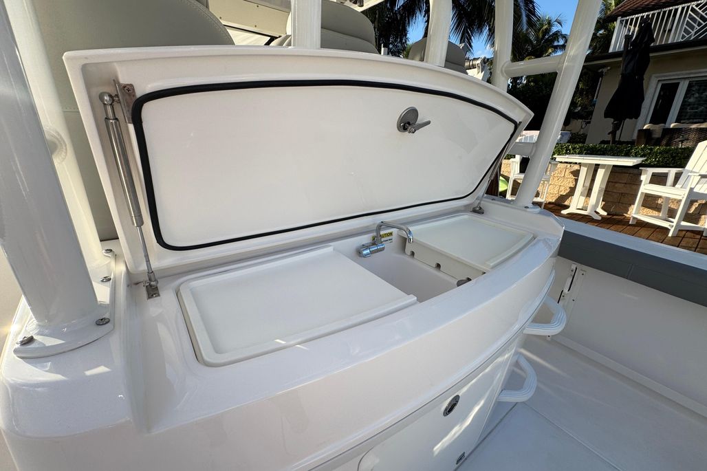 In addition to its abundant amenities, the 335cc continues Everglades Boats’ commitment to fishability. It’s larger console and hardtop, plus the bigger built-in coolers and fishbox storage allow for any fisherman to drop a line with ease. The 325cc’s bait prep area and tackle storage were reconfigured to provide a more intuitive experience on the 335cc.