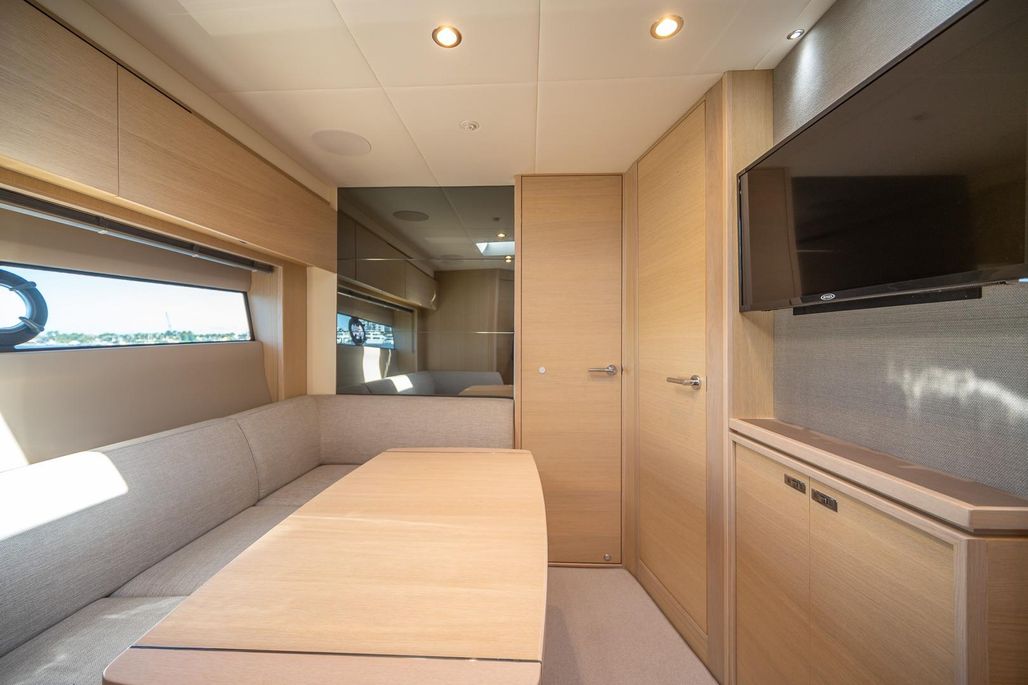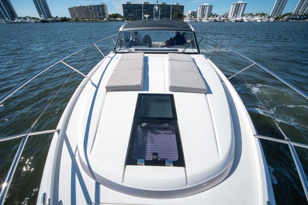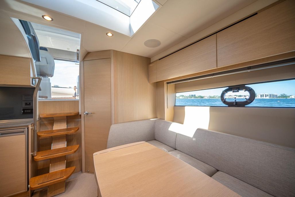 Below deck, the Princess V40 interior is bright and contemporary with high-end finishes, premium upholstery, and thoughtful use of space. The forward master stateroom offers a comfortable island berth, while the mid-cabin provides additional sleeping accommodations for guests. A fully equipped galley, modern head with separate shower, and ample storage makes this yacht ideal for overnight or extended cruising.
