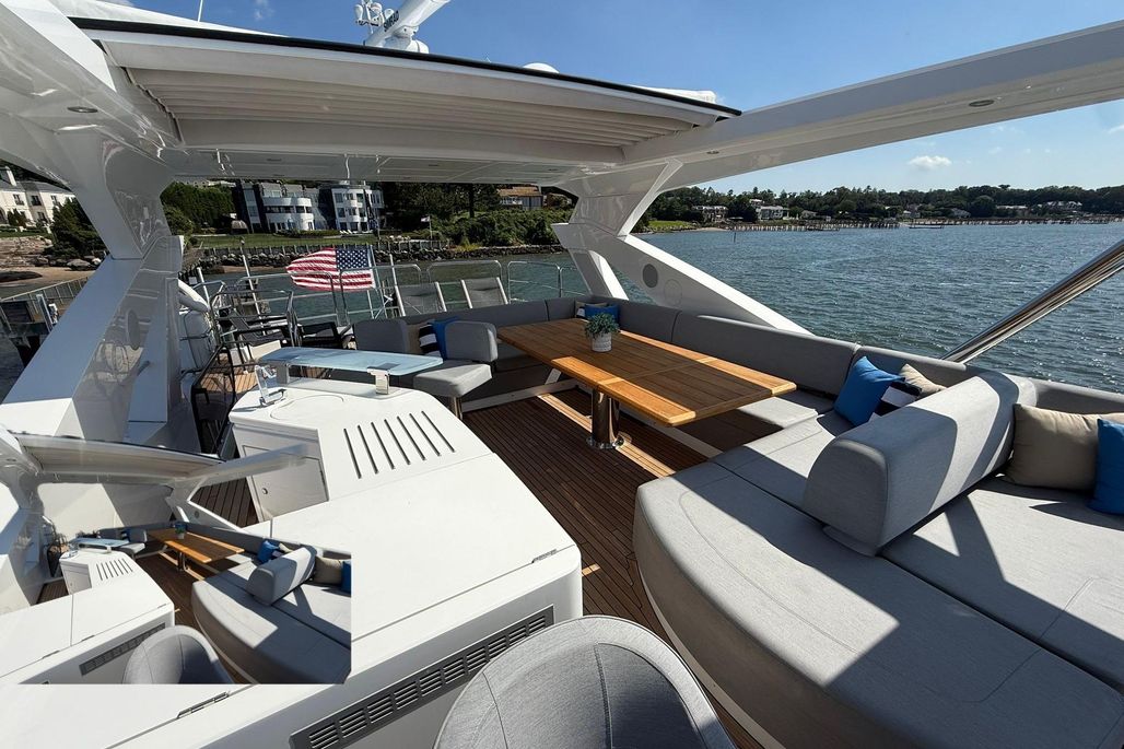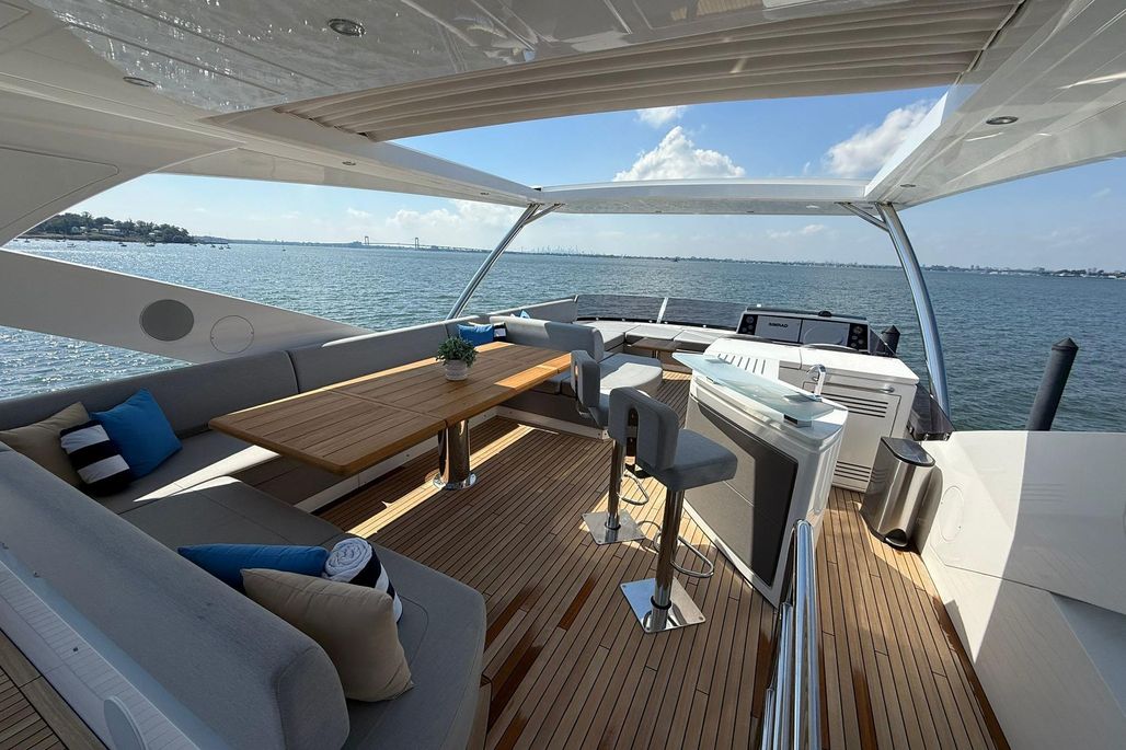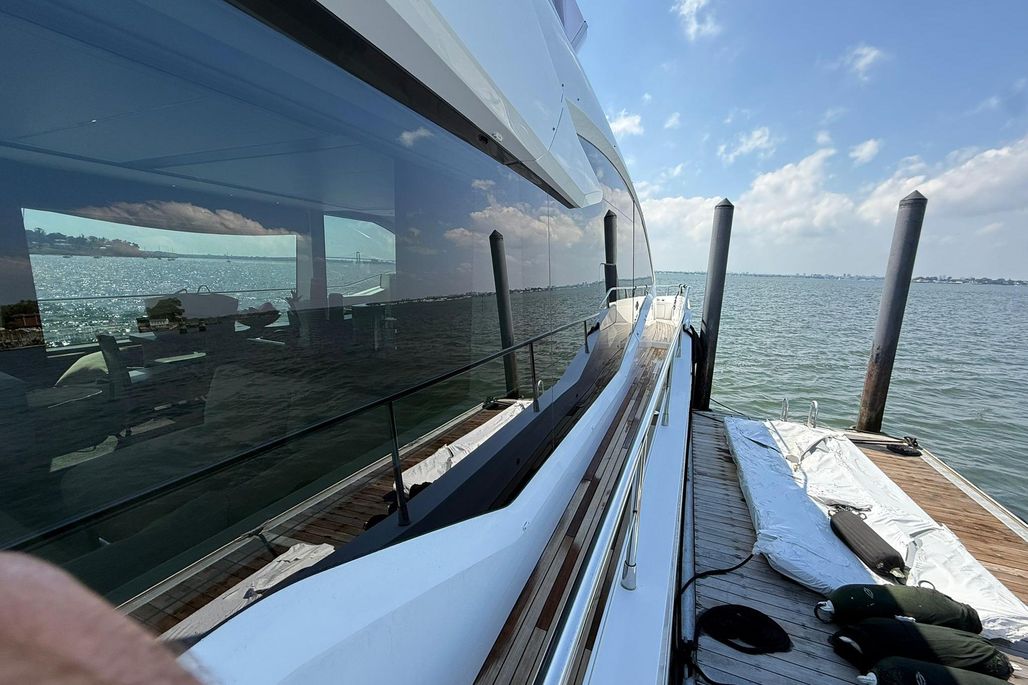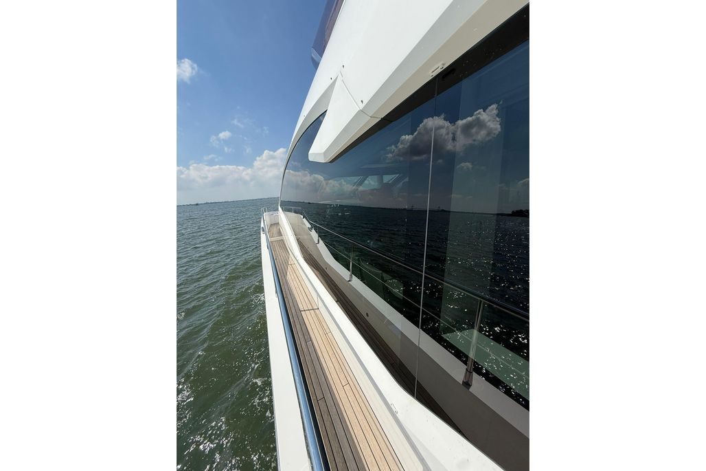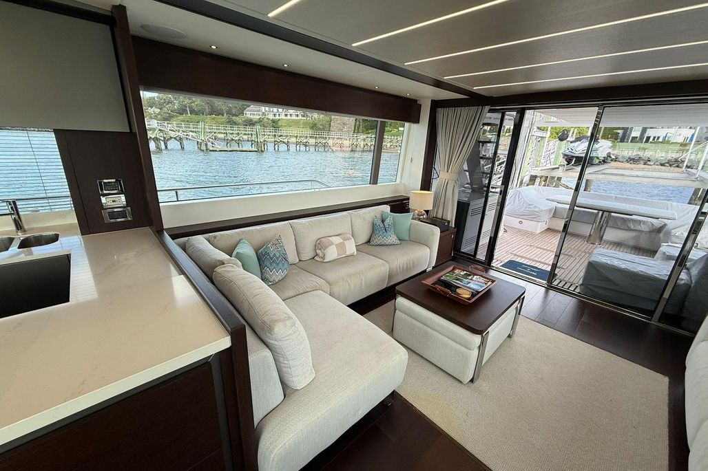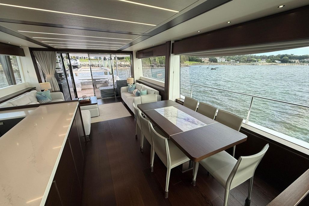 From the moment you step aboard, you're met with a sense of scale and refinement. The expansive main salon is bathed in natural light thanks to panoramic glazing and large sliding glass doors, creating a seamless indoor-outdoor living experience. Luxurious materials, custom furnishings, and a modern layout elevate the onboard atmosphere, ideal for both relaxation and entertaining.