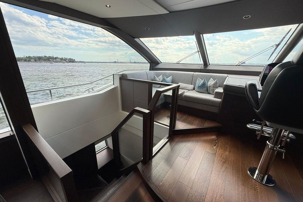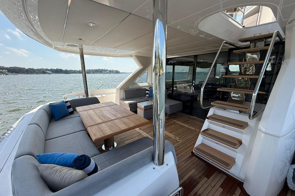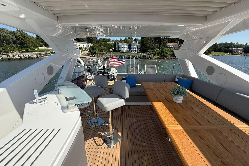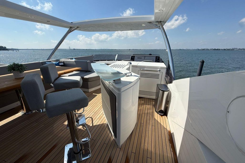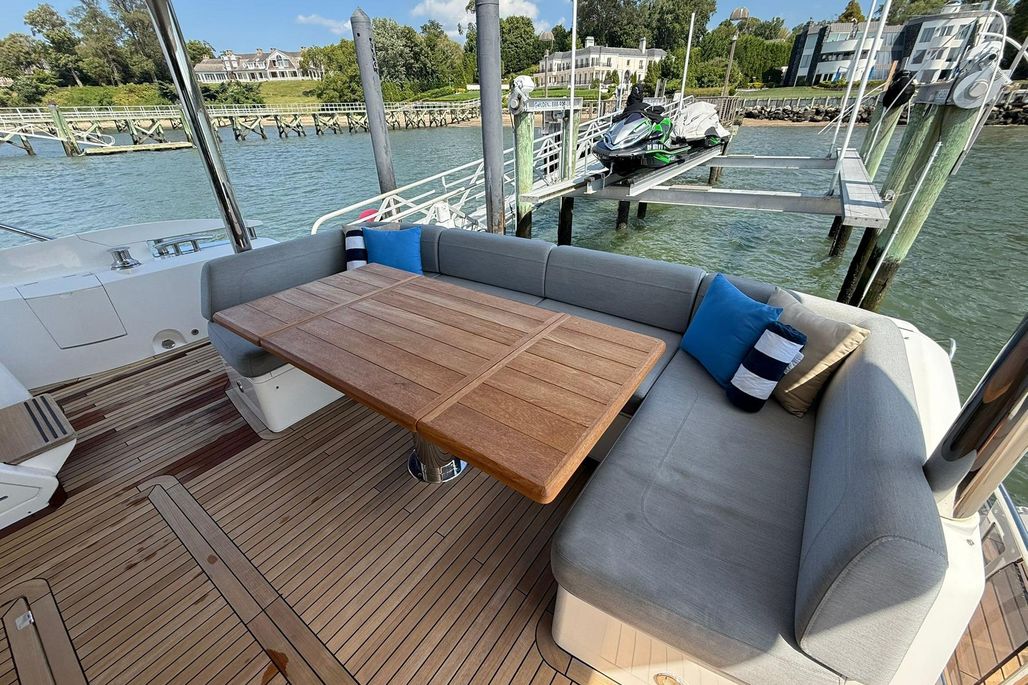 The flybridge is an entertainer’s dream—featuring generous sunpads, wet bar, dining area, and hardtop.