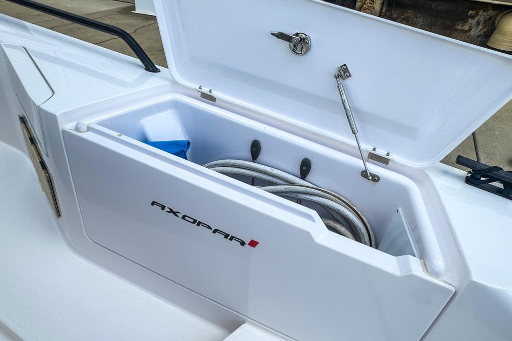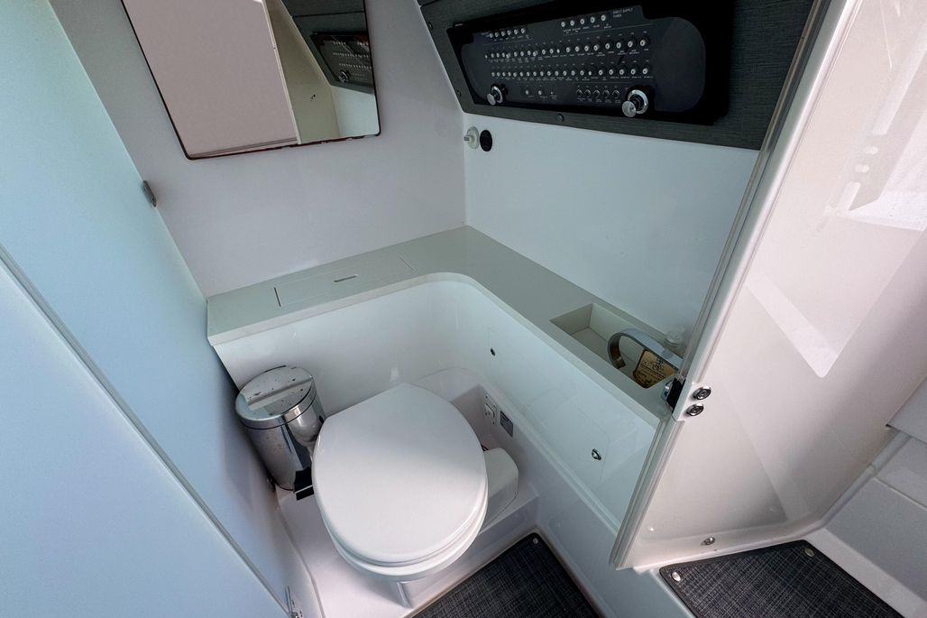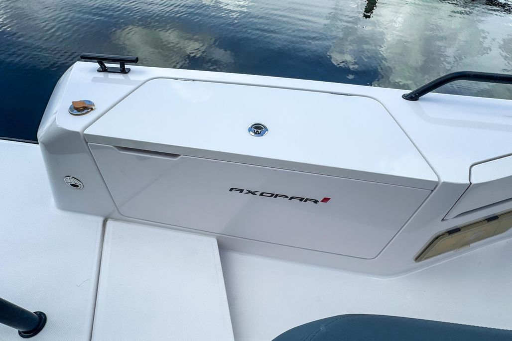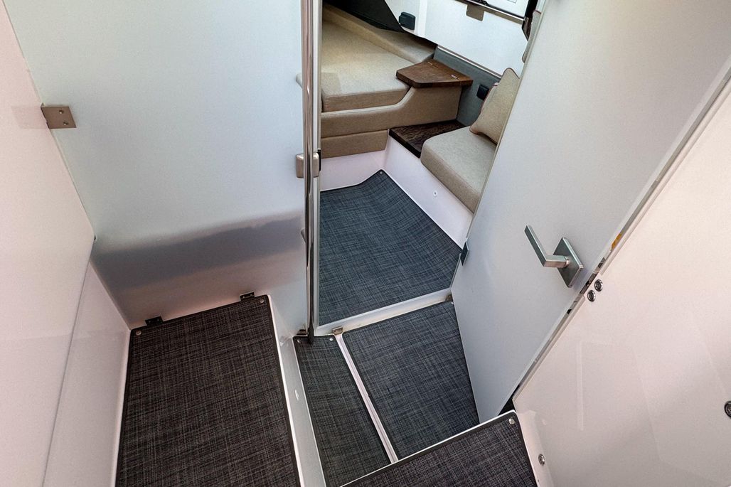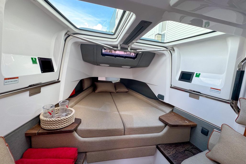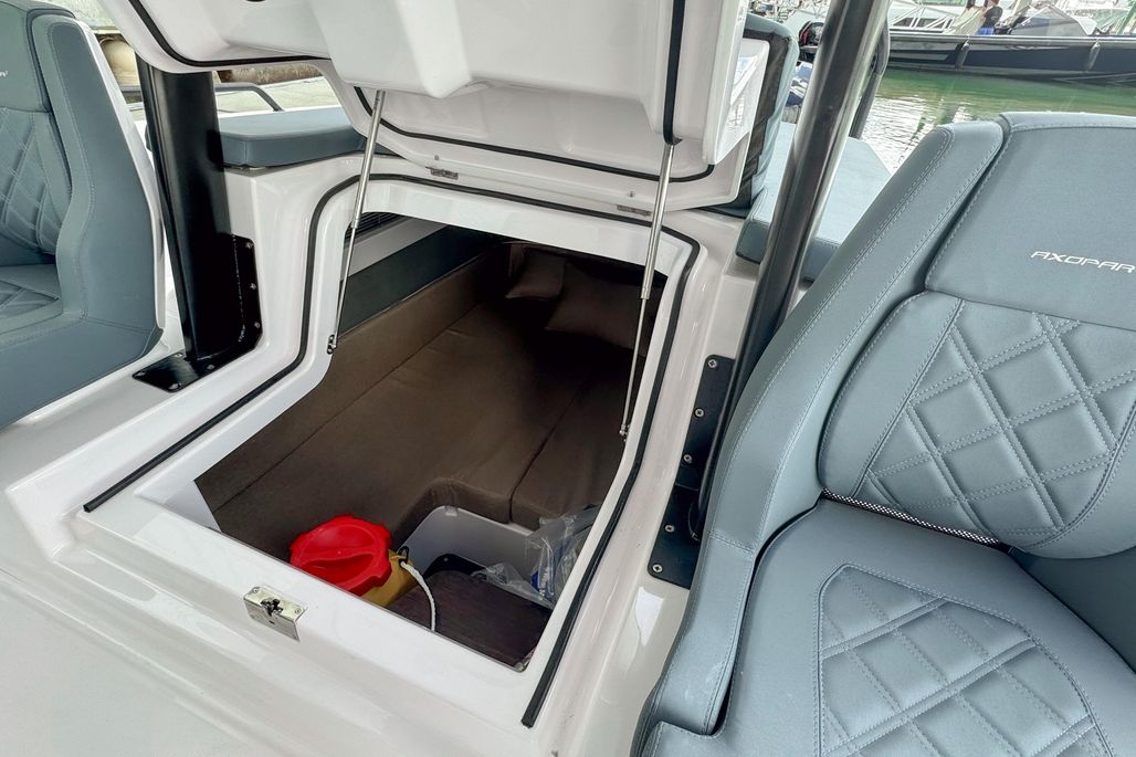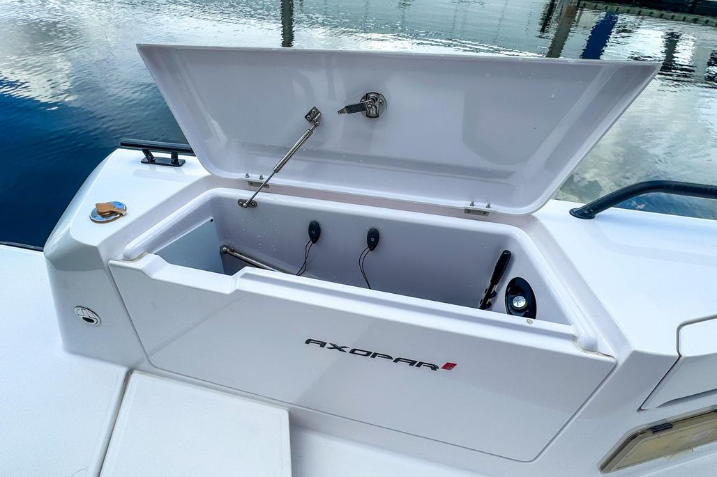 Key highlights include Axopar’s signature gullwing doors, which enhance connectivity and walkability by opening the cabin directly to the deck, and a separate enclosed toilet compartment for extra privacy during long days on the water.