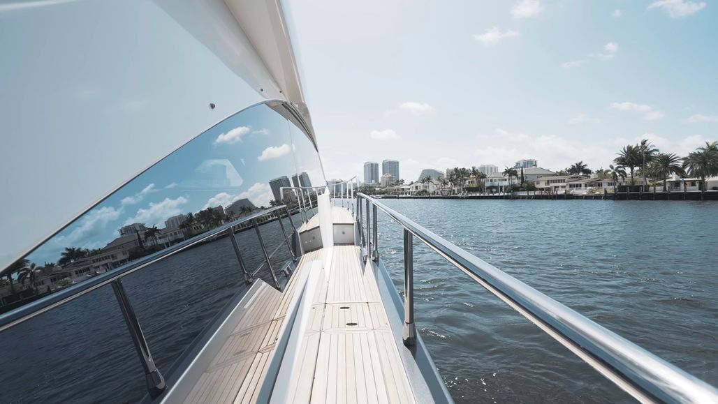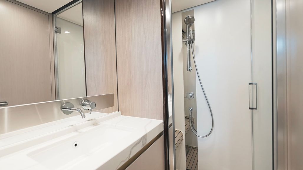 The layout was clearly designed with real life in mind. Three staterooms and three heads means everyone gets space and privacy. The galley and salon connect in a way that feels open and social, with the standout feature being the starboard side settee and its adjacent floor to ceiling window. The flybridge is larger than you expect on a 60-footer, offering plenty of seating and room to host without feeling crowded. Forward, the bow features the modern recessed design with a convertible sunbed and opposing lounge seating—perfect for relaxing at anchor or cruising with company.