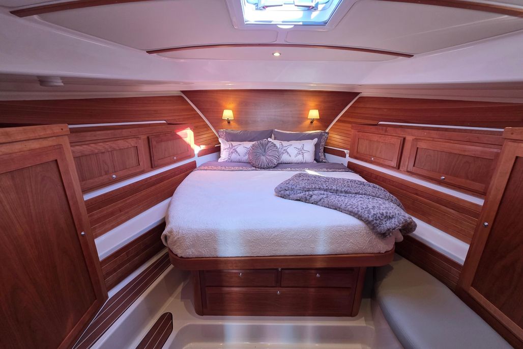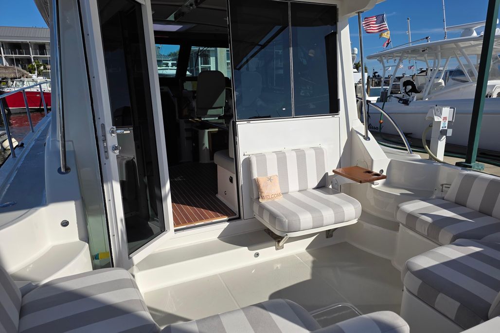 - A new aft-facing cockpit seat to starboard, complete with a folding armrest and drink holder, paired with a new salon door to port with a bi-fold window to starboard (above the aft-facing seat).