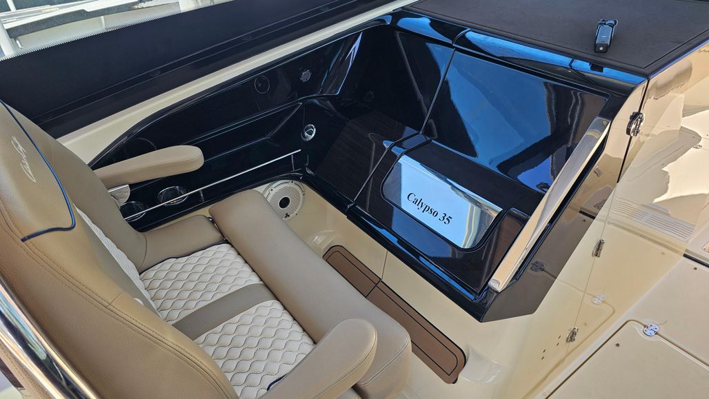 Powered by triple Mercury Verado 300 outboards, the Calypso 35 offers impressive speed, smooth handling, and top-tier fuel efficiency. Whether you're cruising the coastline or heading offshore, this boat handles it all with style and ease.