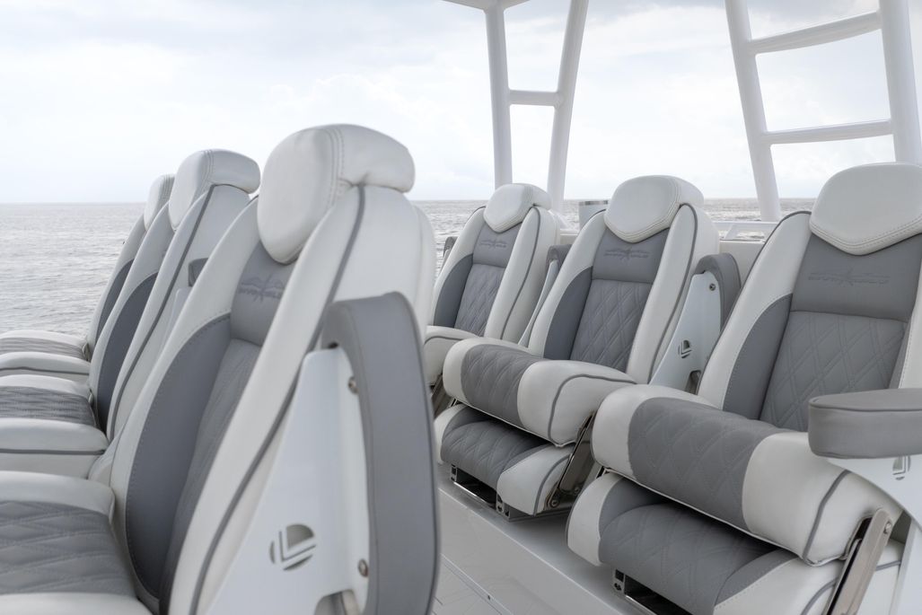 Double row seating with custom embroidered lebroc seats with individual pedestals