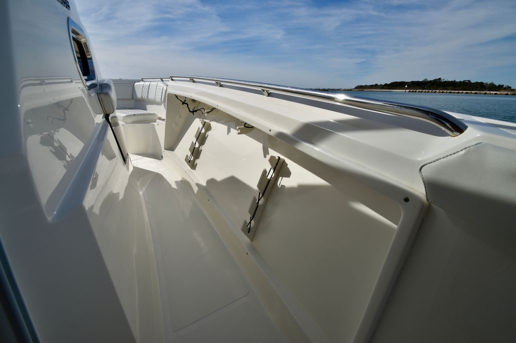 Ergonomically designed helm seating and dash for the ultimate in comfort and control. And the fact that it’s the only center console in the 34' to 35' market to have an enclosed head. Whether you are socializing on deck, driving to your secret fishing spot or taking a moment to yourself, you’ll appreciate the thoughtful craftsmanship instilled in every inch. Plus, forward-facing lounge seats in the bow, side coaming storage and built-in rod holders add to the ways you and your family can enjoy this boat.