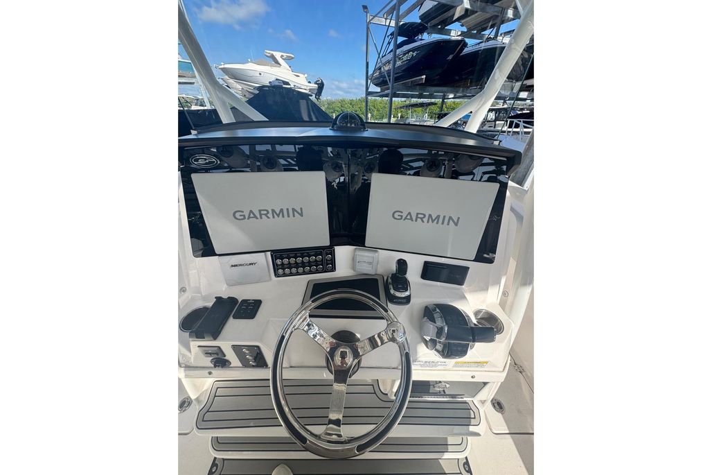 For fishing enthusiasts, the standard features include pressurized live wells (50 gallons and 35 gallons), four insulated in-deck fish boxes, fresh and raw water washdowns, and a 65-quart cooler that slides out electrically. The vessel is equipped with over 30 rod holders, as well as two tackle centers and a rigging station located in the helm module. Built on a high-performance stepped hull, the 328 Commander is powered by twin Mercury 400hp outboards, allowing it to reach a top speed of 50 knots. Overall, the 328 Commander provides an exceptional amount of the boat for the money.