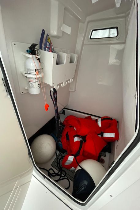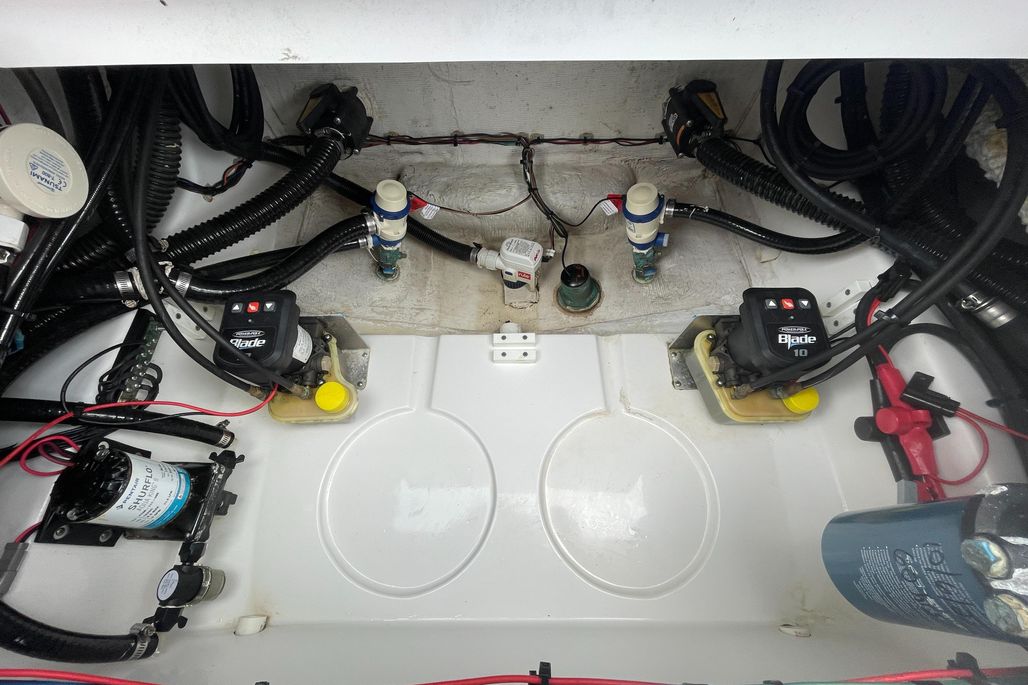 Outfitted with dual Garmin 1243xsv displays, Garmin VHF, an Airmar B60 thru-hull transducer, Siren marine boat monitoring system and a jackplate for optimal motor height adjustment, you’ll get precise control and performance on any water. A 36V Minn Kota iPilot trolling motor with quick release mount and two onboard chargers, along with dual 10' Power Pole Blades, make shallow water fishing effortless. Trim tabs, aquarium-style live wells, coffin box, tackle storage, and forward factory rod holders round out the fishing setup.