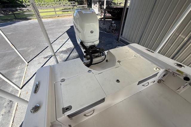 She’s fully outfitted with lockable rod storage under the forward seating, a 26-gallon livewell, and a 69-gallon insulated in-floor fishbox — all designed for offshore adventure. Two foldaway stern seats reveal a large aft casting deck, while forward-facing bow seating with detachable backrests offers comfort for cruising.
