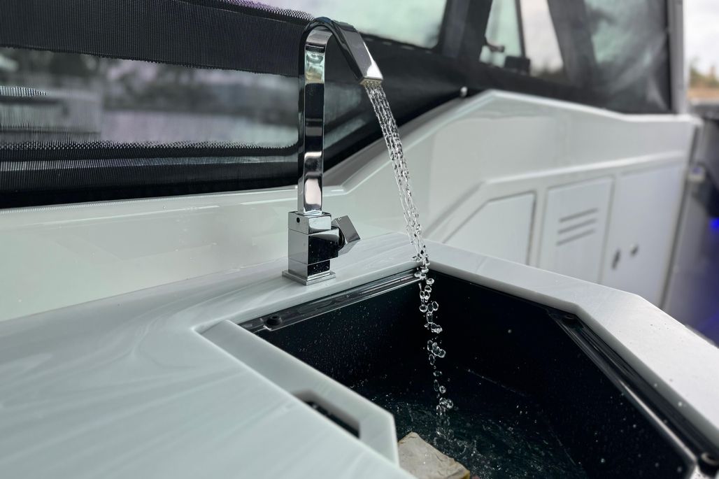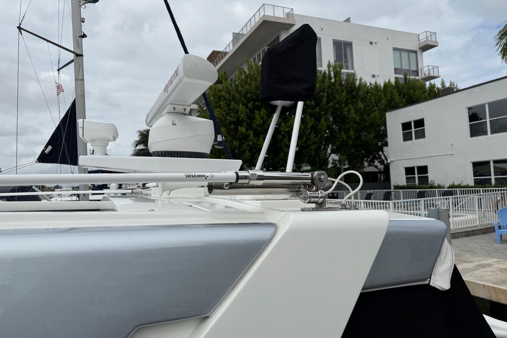 This well-appointed yacht also includes additional features such as a bow thruster, stainless steel LED bow docking lights, a motorized mast light, and stand-up paddleboard racks for added convenience and enjoyment. With a range of 220 miles, it's ideal for extended excursions, offering the perfect blend of luxury and performance for those who appreciate the finer things in life on the water.