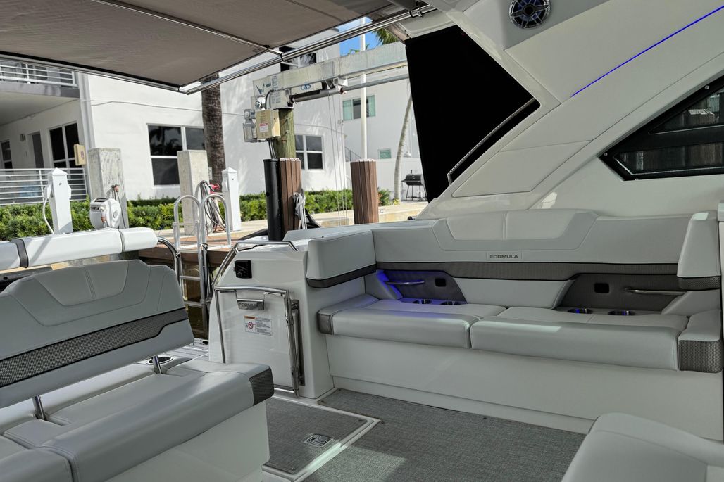 The versatile Formula 400SSC features modular seating with Corian accents, a powered adjustable-height cockpit table, and a swim platform sport station with drink holders, perfect for entertaining. Relax under the Sureshade™ electric power retractable sunshade, with all-weather Sunbrella®/Seamark™ covers protecting your investment.