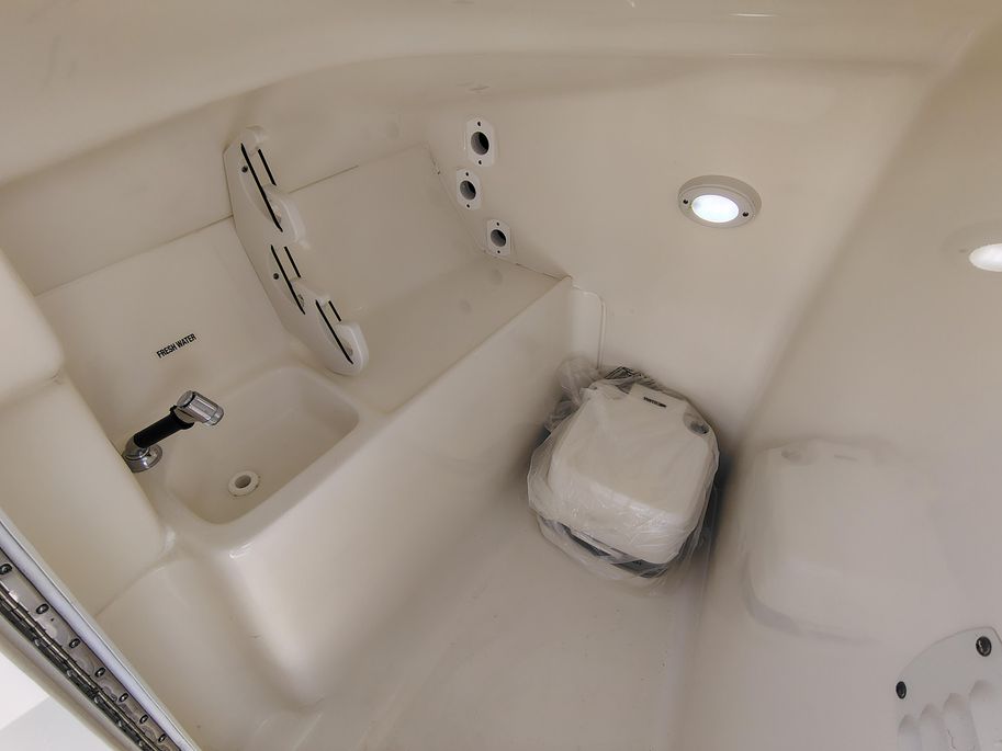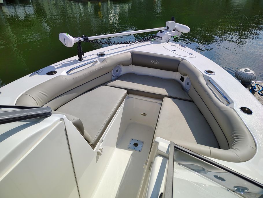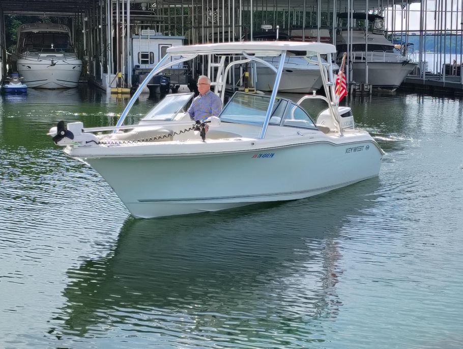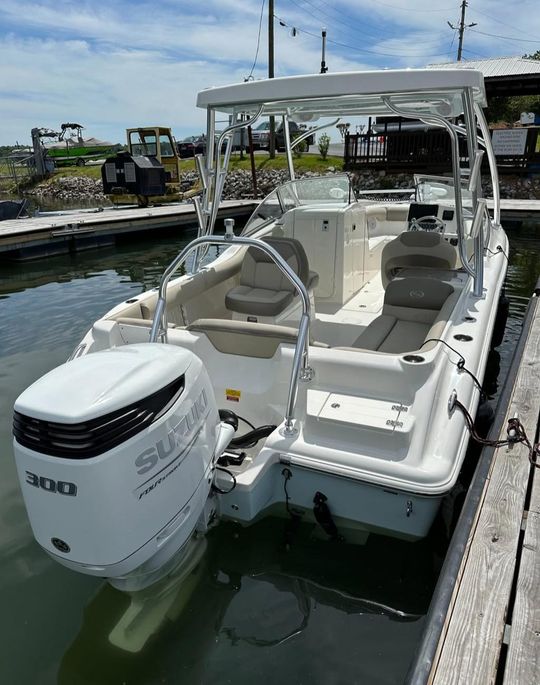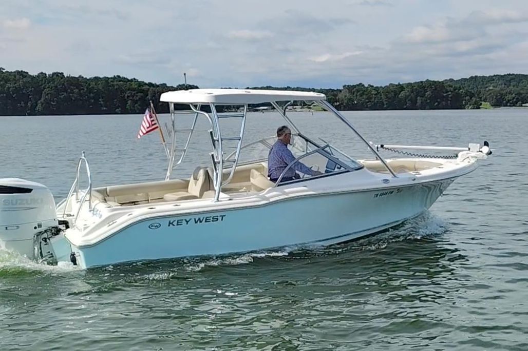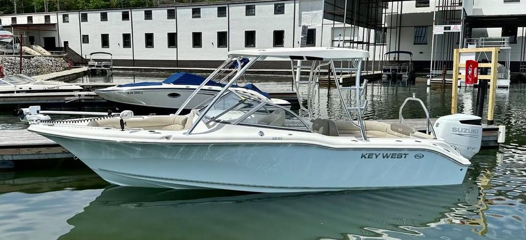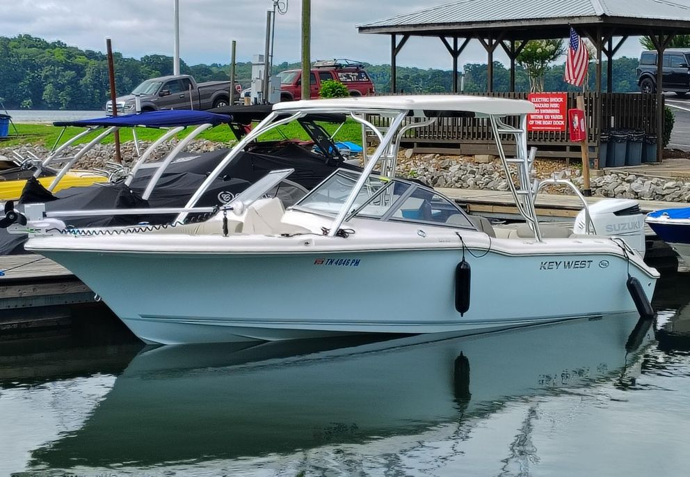 Introducing the 2023 Key West 239 DFS! A stunning Ice Blue dual console boat that embodies versatility and performance. This boat has been dry stored since new and has only been operated in fresh water! This vessels no wood- no rot constructed hull features a fiberglass modified Vee hull shape, ensuring a smooth ride across various water conditions and the Closed-Cell Positive Foam Flotation ensures the boat remains afloat even if swamped. Powered by a robust Suzuki 300hp outboard engine, the boat delivers an impressive cruising speed of 32 mph, making it perfect for both leisurely outings and spirited adventures. With only 40 hours of use, it promises reliability and excitement on the water. The 239 DFS is designed for comfort and convenience, equipped with a head and also wrap around aft seating, bow cushions with filler cushion and a custom sun shade for added functionality. Its thoughtful layout flows beyond the delux captains chair allowing for enjoyable days spent with family and friends with features like a lounge with 60qt under cushion cooler, 36qt cooler, pop-up cleats and fender holders, a ski pole and additional lighting in the hard top as well as underwater, making it an ideal choice for those seeking a blend of performance and leisure. Additional features include:
