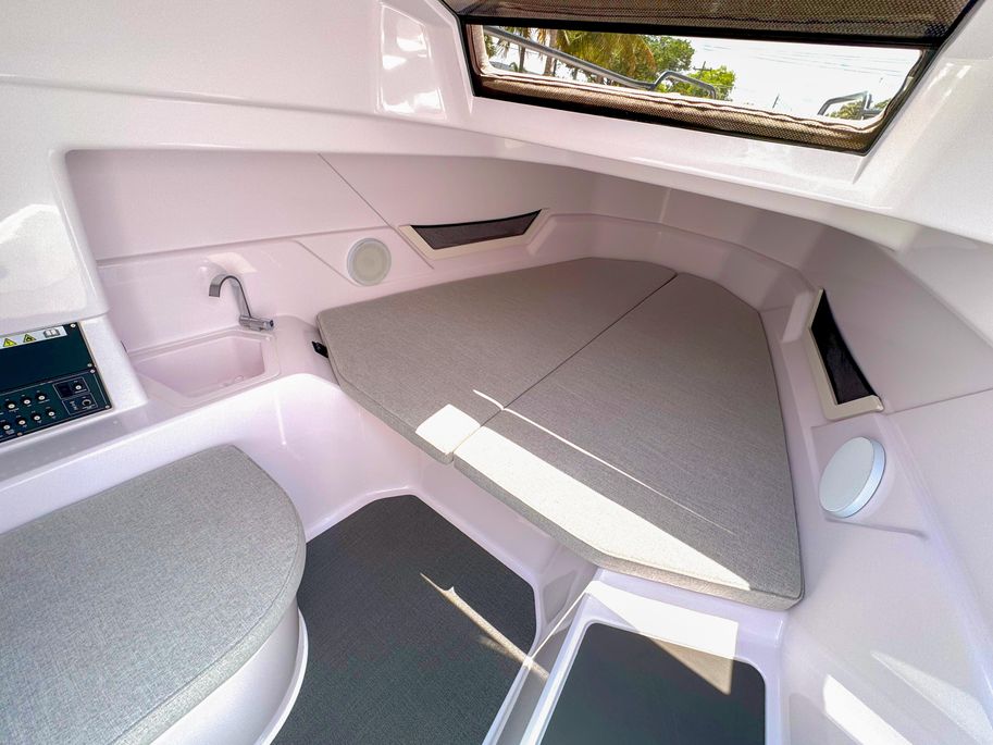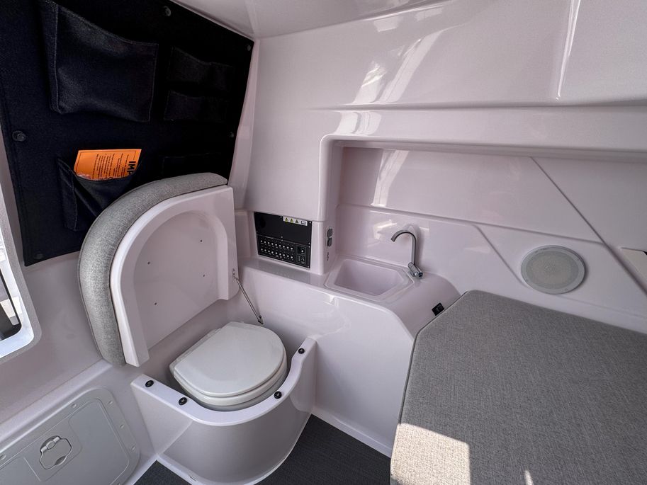 Inside, you’ll find a cozy enclosed cabin with a private head, offering comfort and convenience for day trips or weekend adventures.