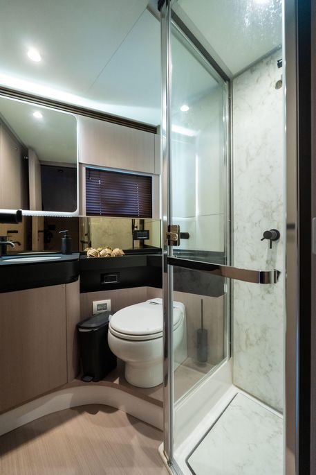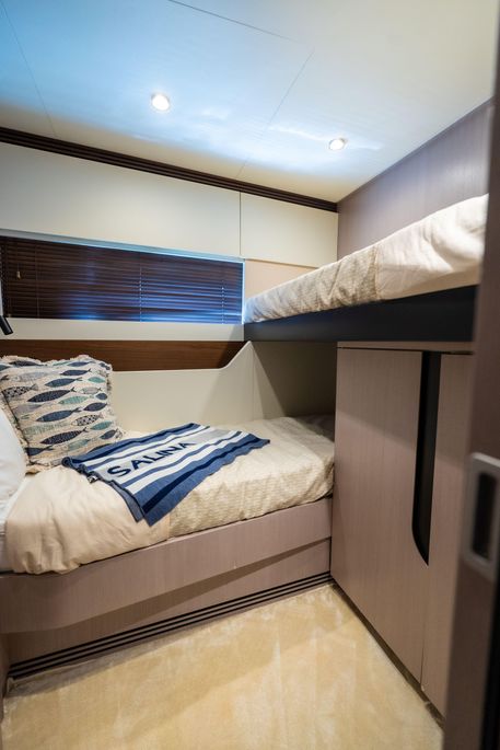 Shaped by an ambitious technological calling to be the most forward-facing sport yacht in her category, the S7 is a paradigm of peak performance and luxurious leisure. A marvel of razor agility and precision, she guarantees the lowest fuel consumption possible and a uniquely quiet allure. The main deck offers a fluid continuum between indoor and outdoor zones, allowing guests to savor their time and space at sea instinctively, in complete and harmonious freedom. Embody an eco-sporty nature with the S7. Thanks to the extensive use of carbon fiber, the adoption of a triple VOLVO IPS engine configuration and a high-efficiency hull, S7 embodies the brand’s revolutionary eco-sport philosophy, delivering maximum performance with a reduction in both fuel consumption and emissions of between 20 and 30% (compared to the traditional propulsion systems), ensuring maximum silence and a sharp, dynamic cruise. The S7’s sporty character is highlighted by her sleek profile, enhanced by the arched line created by the extensive glazing that runs seamless along the superstructure. This magnificent graphical sweep and the cutout bulwarks allow natural light to fill the interiors as much as possible. The carbon fiber-enhanced superstructure offers more spacious environments while maintaining excellent levels of performance and stability. The interior lounge is cool and modernly organized, flooded with light from the large side windows. A deep knowledge of life at sea cultures the latest trends and original design concepts by interior designer Yachtique to realize a dynamic and divergent interior scheme for the S7. The neutral palette of matte-finished colors is at once cozy and chic, softening the sleek, modern furnishings. The surfaces and spaces are designed to minimize obstacles and enhance continuity, expressing the series’ sporty DNA on the inside as well. S7 is the dream boat for contemporary owners who are dynamic and sporty, who love cruising in grand style and in absolute safety, and who also like to keep a close eye on sustainability.