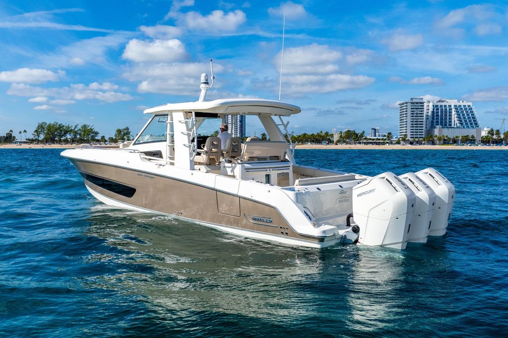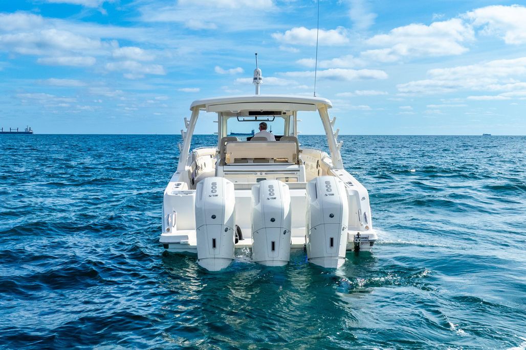 2024 Boston Whaler 420 Outrage with white triple Mercury 600hp V12 Verado outboard engines with joystick piloting. Engines have approximately 175 Hours.