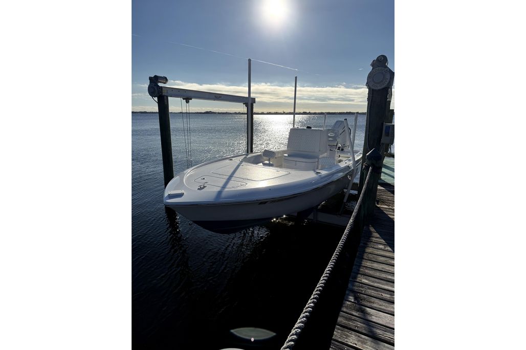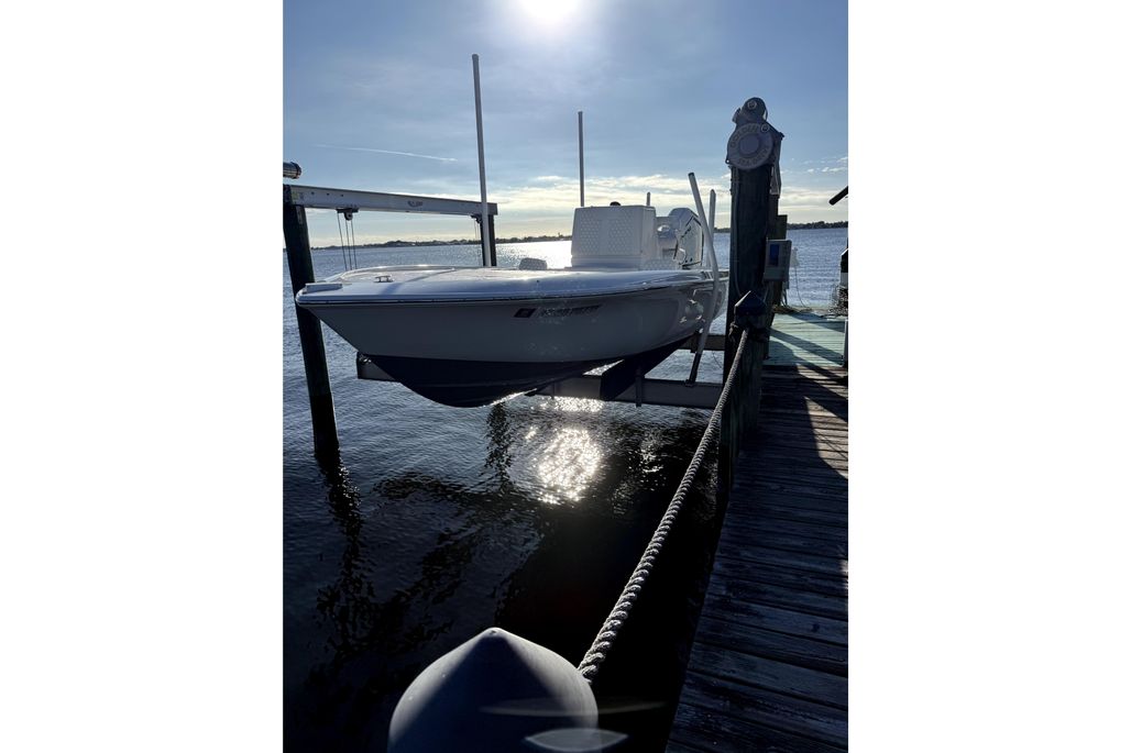 This 26 Bay is well-equipped for serious fishing, featuring a trolling motor (never used), dual Power-Pole shallow water anchors, livewell plumbing, rod holders, electric reel outlets, and a forward casting platform. A battery charger is installed for convenience and easy maintenance, and a hydraulic transom jack plate enhances performance and versatility across varying water depths.