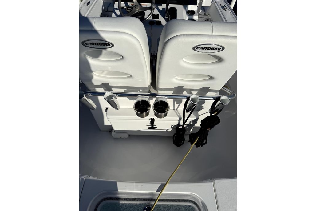 Designed with both comfort and functionality in mind, the boat includes forward bow seating, pop-up aft jump seats, and an open layout that transitions seamlessly from fishing to cruising. Finished in white with silver gelcoat on the hull bottom, this Contender has a clean, sharp appearance that complements its performance-driven design.