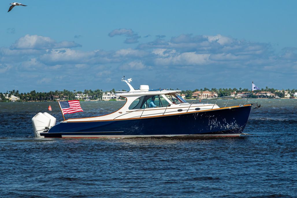 KING’S LANDING is a highly optioned Hinckley 35 featuring the upgraded Mercury V10 350hp outboards with joystick steering, bow thruster, Seakeeper stabilizer system, Garmin electronics, generator, air conditioning, Starlink connectivity, teak decks, flag blue hull paint, and stainless handrails and bow rail. She is Hinckley-maintained and easily shown while in South Florida for the winter.