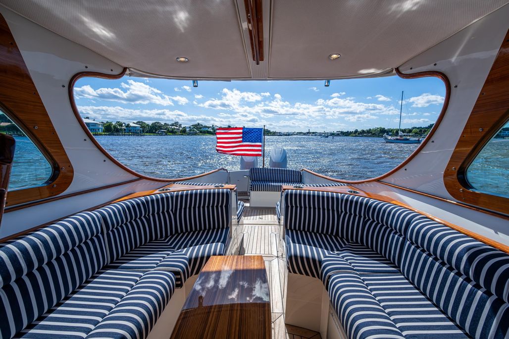 - Cushioned settees port and starboard upholstered in blue and white stripe Sunbrella fabric