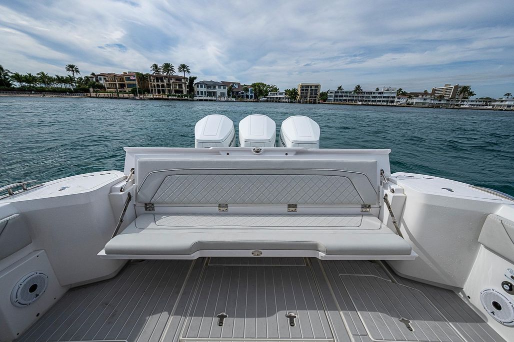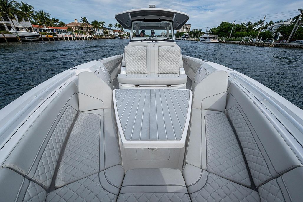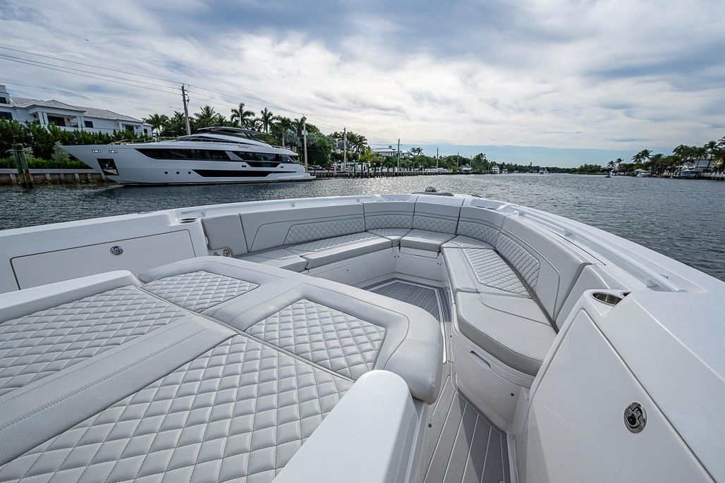 Forward, the bow lounge offers both luxury and versatility. Wraparound seating surrounds a hi-low actuating table that transitions from flush deck mode to a full lounge filler or raised dining height. Integrated storage beneath the seating keeps the deck clean and uncluttered. The boat’s wider beam and extended running surface are precisely balanced for twin, triple, or quad outboard power, while Intrepid’s signature stepped hull delivers a smooth, dry ride with confident offshore handling.
