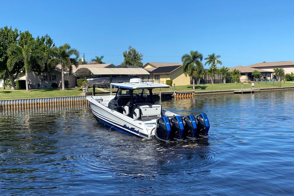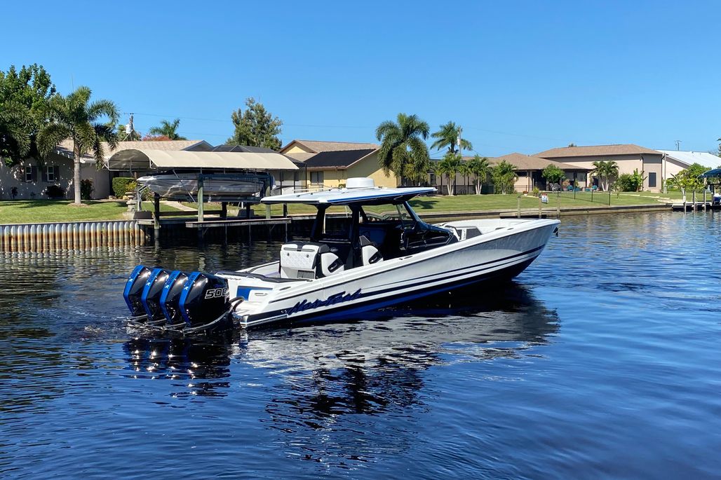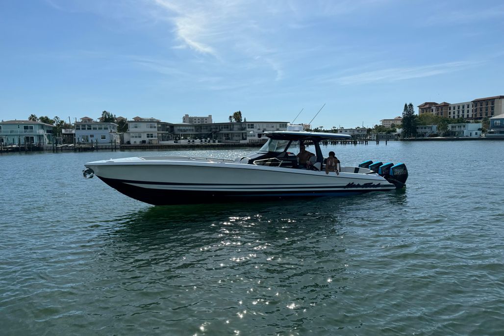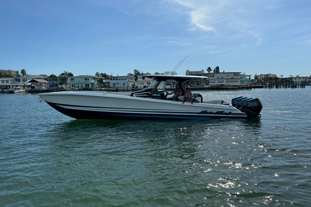 This Nor-Tech 400 SuperSport Center Console is in absolutely pristine condition and comes with the Evolution Trailer!!! Here is your opportunity to get into one of the most desirable Hi-Performance Center Consoles in the industry. The 400 SuperSport is a hard boat to get a hold of, not many are built and this one is among the most well equipped 40's that have been built. It has been meticulously maintained and stored on a covered lift and in an Air Conditioned Garage since new. The boat has an amazing power package with the Quad Mercury Racing 500 R's which pushes up to speeds of about 95 MPH! There are only about 100 hours on the engines. The engines have Mercury Platinum Warranty on them till 12/ 1/ 2028! The paint job is incredible and consists of a very pretty Pearl Metallic White on the Hull Sides, Deck & Interior walls. The stripes are done with an Electric Metallic Blue and Sterling Grey Metallic. This boat is loaded with some very nice Features Including Air Conditioning in the Cabin with a separate enclosed Head. It also has a FLIR Night vision Camera, (2) Garmin 22" Screens, Bow Thruster, Apple TV, Auto Pilot, XM Weather / Radio, 24" Radar Dome, & a 30" Light Bar. The boat has the Second Row Seating set up so people feels safe & comfortable running along at any speed. You have great visibility and control. There is comfortable seating all over the boat and all the upholstery is in perfect condition. There is a Sure Shade (Power Retractable Shade) in the Hard Top which extends about 7' and gives you a ton of shade in the back and covers the Club Sport Seating in the back. The boat is equipped with the Marine Guardian Security System to track the boat and it will alert you when someone boards as well. This is the perfect boat for doing anything from running around hitting the local hot spots to doing long runs in the Bahamas. It is an easy boat to take care of and has the amenities to keep you comfortable on long trips. Other options include, (4) Underwater Lights RGB, Huge JL Audio Stereo w/ LED Lighting RGB, VHF Radio, Zero Effort Controls, Painted Engines, 1KW Transducer, Sea Deck Flooring, Electric Bow Table, & Forward Facing Bow Backrests.
