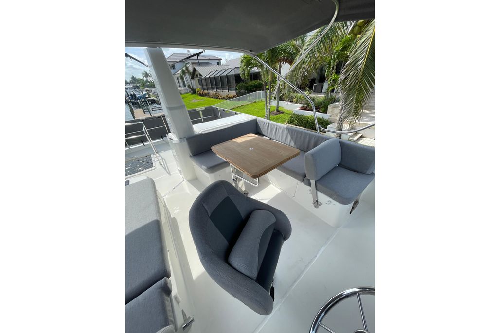Aft galley opens to cockpit with a sliding bench and swim platform access