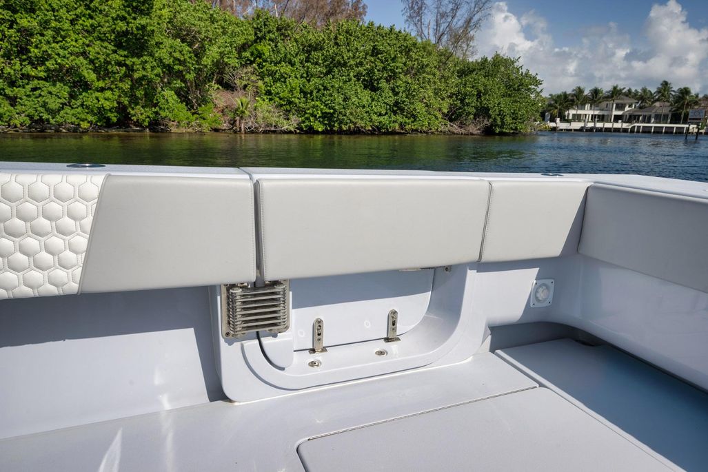 Among the 44ST’s innovative features are the port and starboard forward seats recessed under the gunnel caps to keep the forward deck space open for fishing. A large lounge seat with three large storage compartments is forward of the center console, providing a comfortable relaxation and sunning area. The console interior features a freshwater head and sink and electrical panels. Large in-deck storage compartments stow gear to the Bahamas or Atlantic Canyons for longer runs.