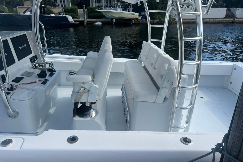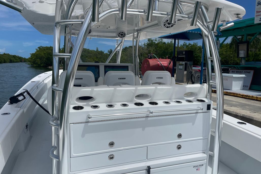 The newest 2025 44 ST Contender to hit the market. The triple 450 Yamaha’s allows this boat to reach a top end speed in the mid to low 60’s with a great fuel burn at cruise. Only 75 hours on the motors with extended warranties that have already been purchased. This boat is also equipped with a seakeeper 3. One of the very unique options on this boat is the “CB liner”. This liner is located in the console and creates a large storage compartment that is great for long range trips to stow away bags and gear. All 2025 model year boats come with an infused hull and digital switching which makes for a clean dash display. Barely used trailer will be included in this sale.