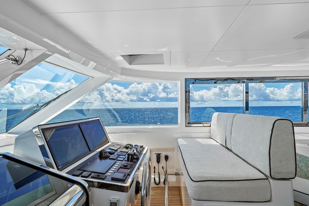 - Expansive flybridge with bar, grill, cinema projector screen, and lounge seating.