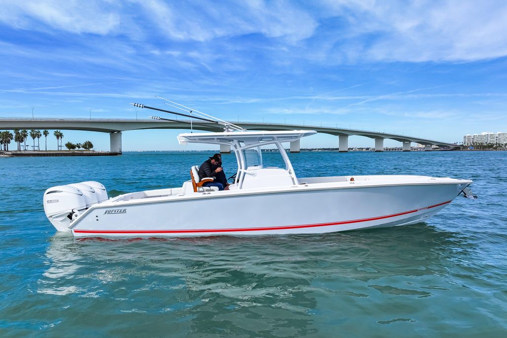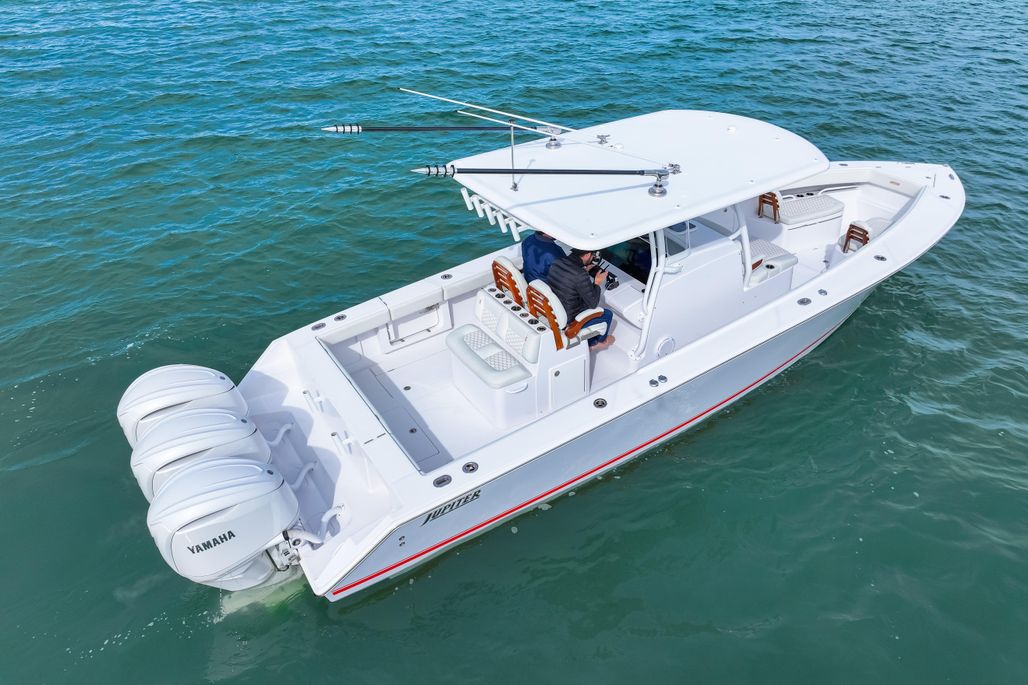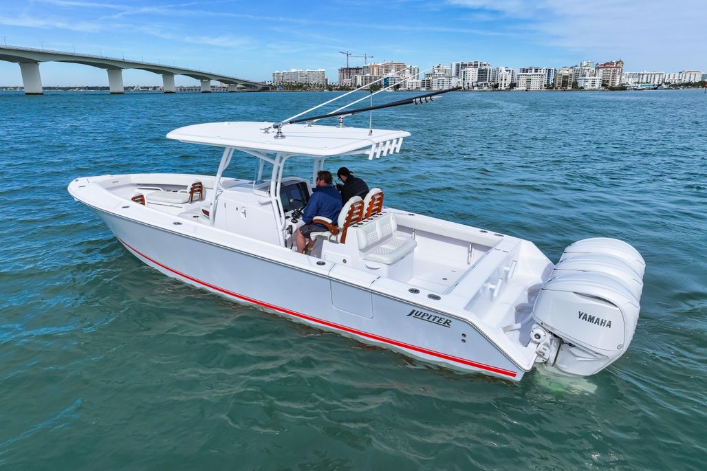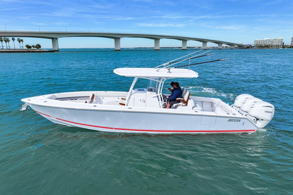 Like new 2025 Jupiter 34 HFS with triple Yamaha V6 4.3 liter 350 HP Engines. The 4.3 liter V6 is the latest in technology and performance from Yamaha outboards. Extravagantly cared for by a knowledgeable owner who has been fortunate to own numerous Jupiter center consoles. One of the finest examples of a late model 34 HFS available. She has never been fished as her condition shows as Bristol. Service is up to date and she is ready to cruise on her next adventure. Ursus is lift kept with detailers aboard weekly while service techs check on her monthly. No expense has been spared in keeping her in Bristol condition. Extended Yamaha Y.E.S. engine warranties through November 5, 2030. This lightly used 2025 Jupiter 34 HFS represents an excellent value with replacement cost exceeding $850,000! Do not miss the opportunity on this highly optioned, late model Jupiter 34 HFS.