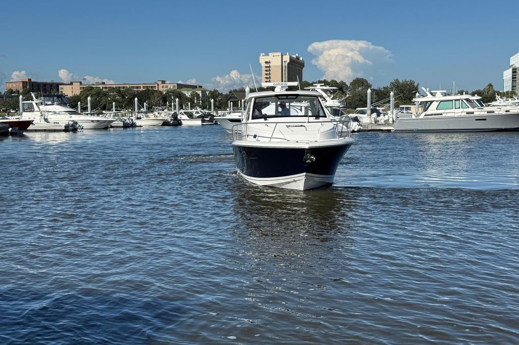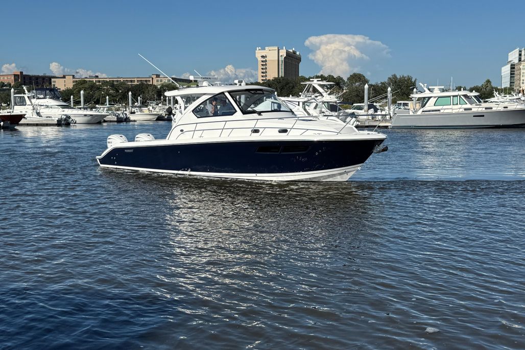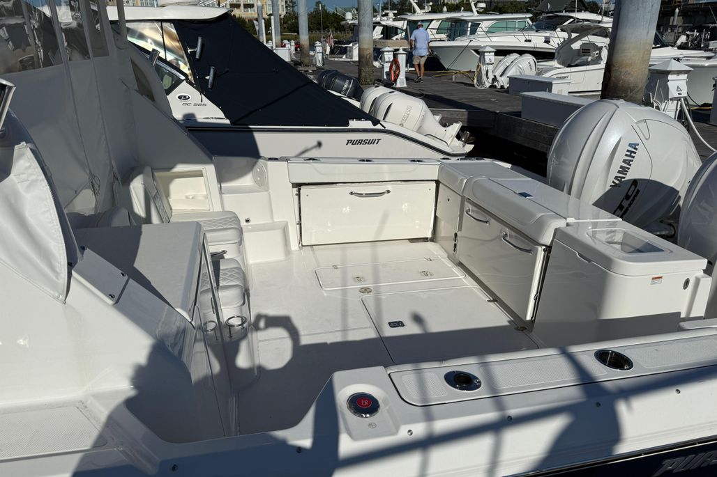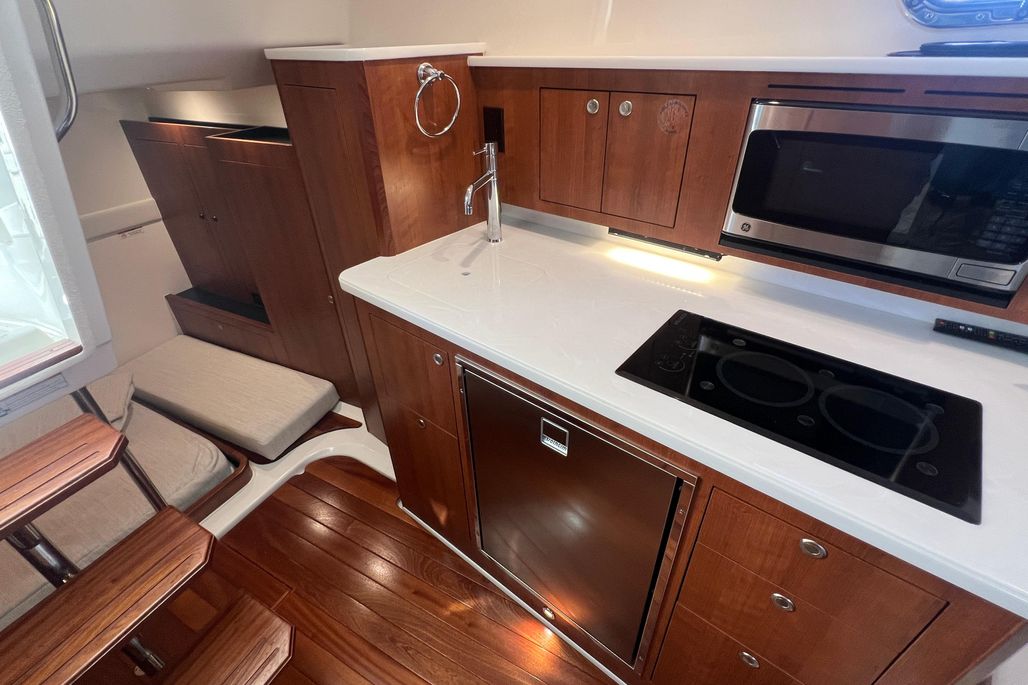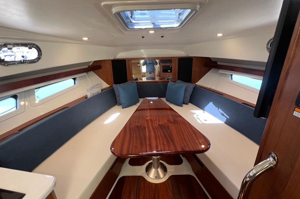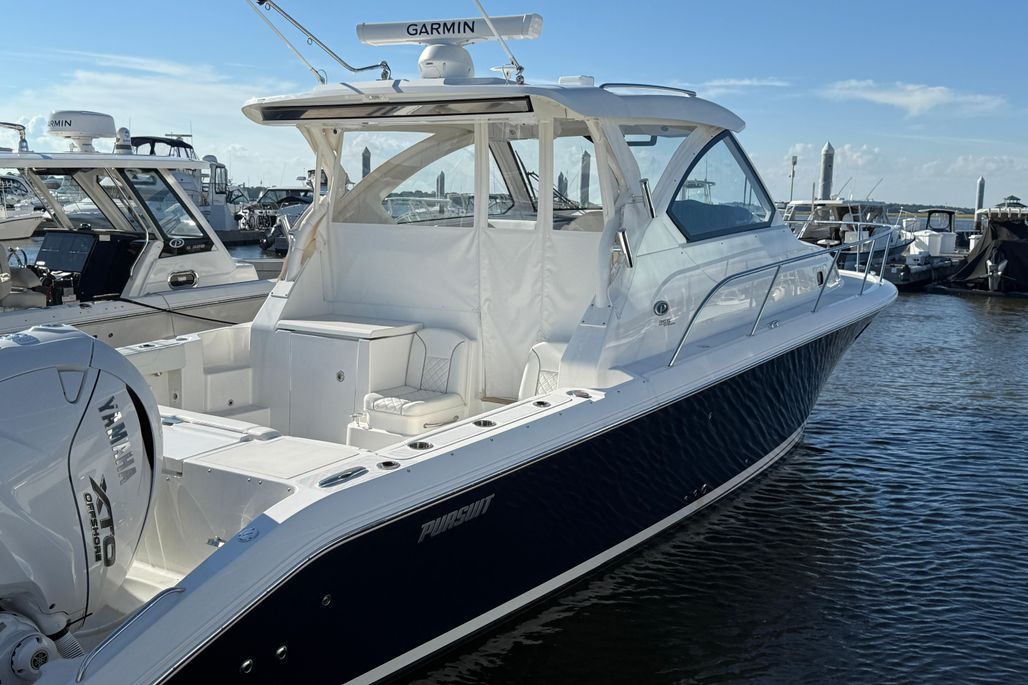 The OS 355 encompasses the winning formula you’ve come to expect from Pursuit. A single-piece optically clear windshield, updated exterior fabrics and finishes with innovative seating arrangements, give you every reason to dive into a brand new offshore. The increased natural light throughout the stylish hull-side windows, stainless steel refrigerator and electrically actuated convertible berth/ dinette are a few of the cabin features that punctuate this model with yacht caliber appointments.