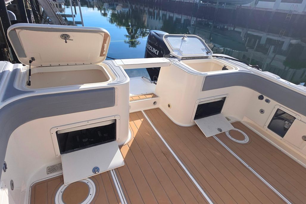 The 330TE boasts all-composite construction. Huge livewells frame the centerline transom door. Cabinets tip out revealing removable tackle boxes and catchall storage. You’ll find undergunwale storage for three rods on each side. Each sponson has a very large fish box, augmented by an insulated coffin box forward of the console. Bottom fishermen will particularly appreciate the mammoth anchor locker that will easily handle 1,000 feet of rode.