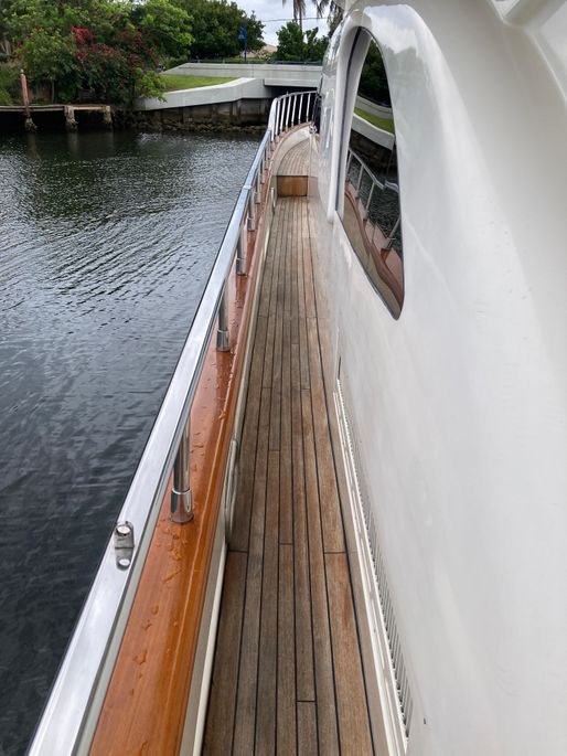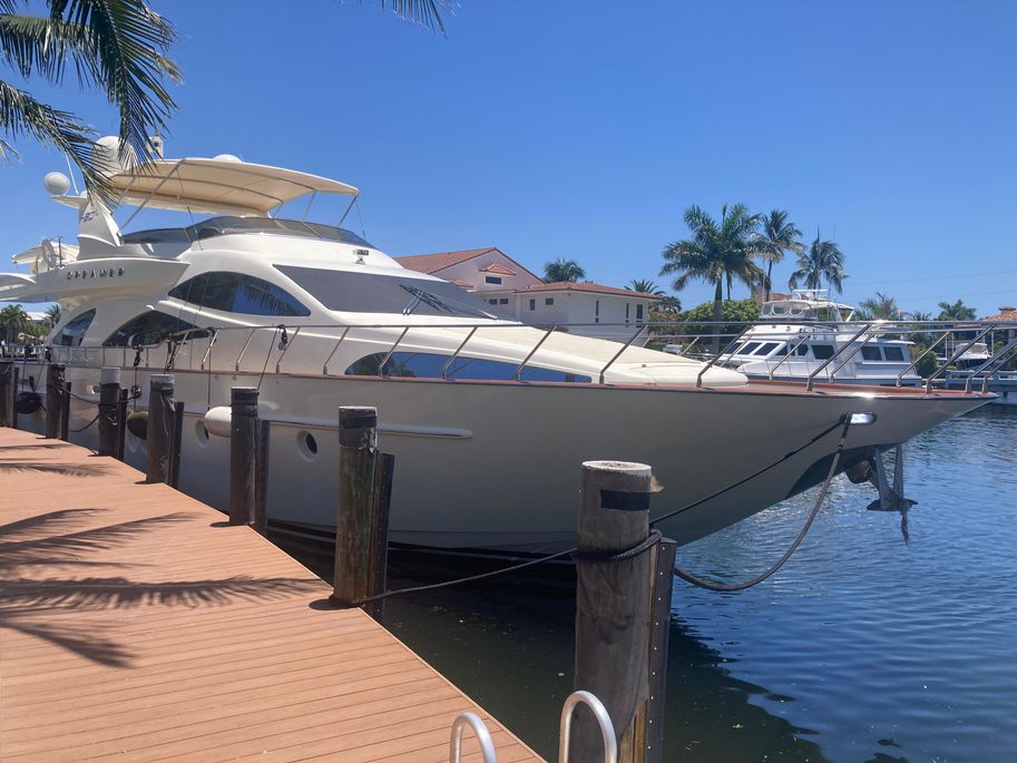 This fine 80 Azimut Yacht is the first hull built with prop tunnels reducing her draft to less than 6'. She has accommodations for 8 in four staterooms that feature ensuite heads. The master stateroom and VIP have queen berths, guest cabin 3 stateroom has a double berth and guest cabin 4 has two single side-by-side berths. Upgrades include ALL NEW TEAK DECKING AND RAIL.(6/2024)New Bimini top, (6) video cameras total, aft deck, transom & engine room, life raft, dock master controller,plus much more. Crew accommodations include 2 crew berths, head/shower and galley area. Fully loaded and in turnkey condition. She has low hours(1460) on her preferred twin C30 Caterpillars.The vessel is easy to see, only 10 min. from the Fort Lauderdale Intl. Airport