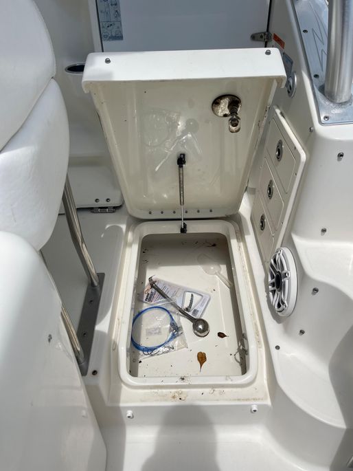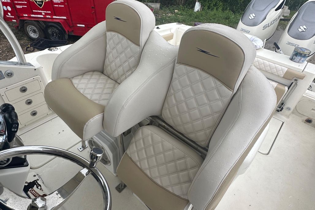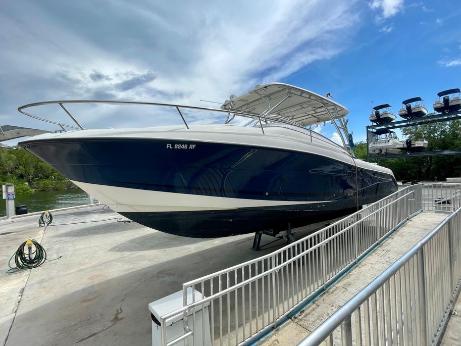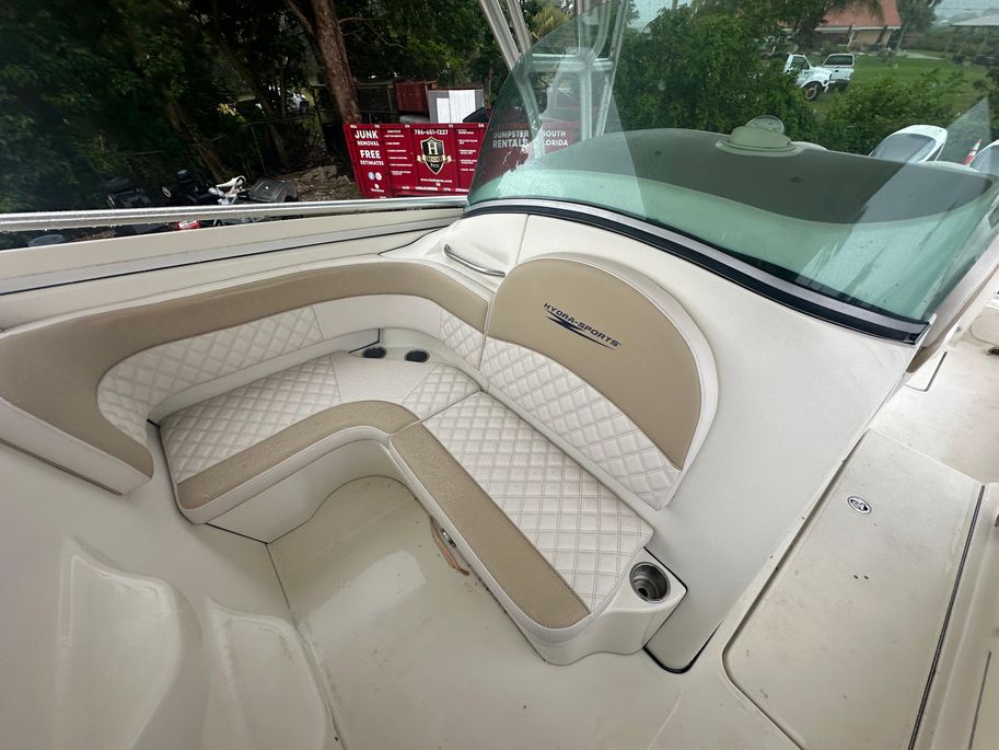This Hydra-Sports 3300 VX Express is an impressive boat that has it all, cabin, galley, huge cockpit with ample seating and an open water ride that will champion all other boats in her class. Her mid cabin interior design is well finished and comes complete with a stand-up head with shower, full-service galley with microwave, a classy teak and holly sole, and berths for five. The deck layout is ready made for cruising in style and comfort or serious offshore fishing. There is a foldaway seat at the transom and a fiberglass hard top that has an overhead sliding hatch. This vessel was re-powered in 2019 with Suzuki 350 Duo-prop engines with only 280 hours. All new electronics were installed in 2019, 2 10-inch Garmin Displays, 10 new JL Audio Speakers and Head Unit, the electric reel connections were installed in 2021. The boat has a new upholstery inside and out with a full cover and bow cushion.
